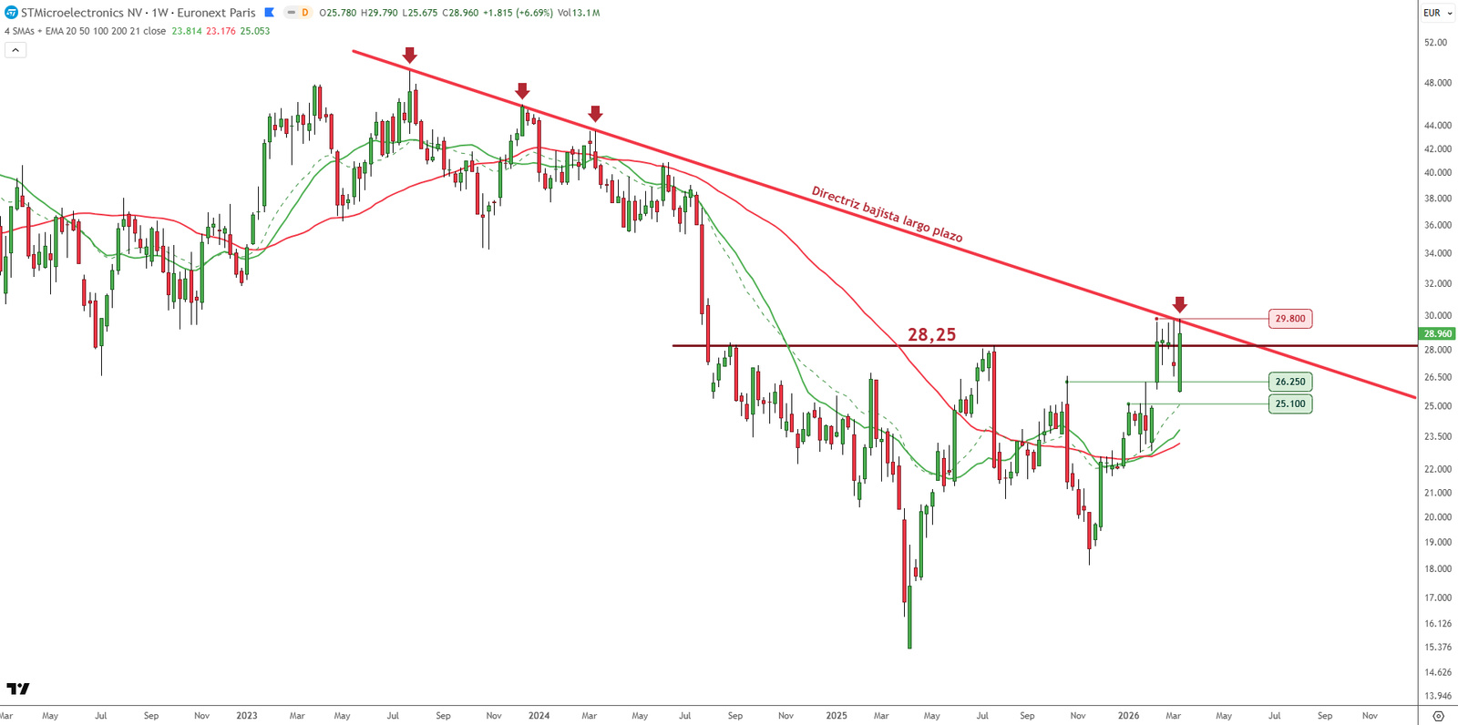 SoundHound AI (SOUN, Nasdaq) Gráfico 30 minutos/diario. En intradía la tendencia es claramente bajista, se aprecia la vigencia de un canal descendente. Para operar en largo además de romper al alza este canal deberíamos esperar la superación de la resistencia de los 4,22 al menos en cierre horario. Además debería de venir acompañado de una rotura de la directriz bajista que se observa en el RSI y de un volumen relativo que pasa a positivo (incremento de volumen comprador). En gráfico diario se pueden observar soportes en 3,11 y 2,40 dólares.