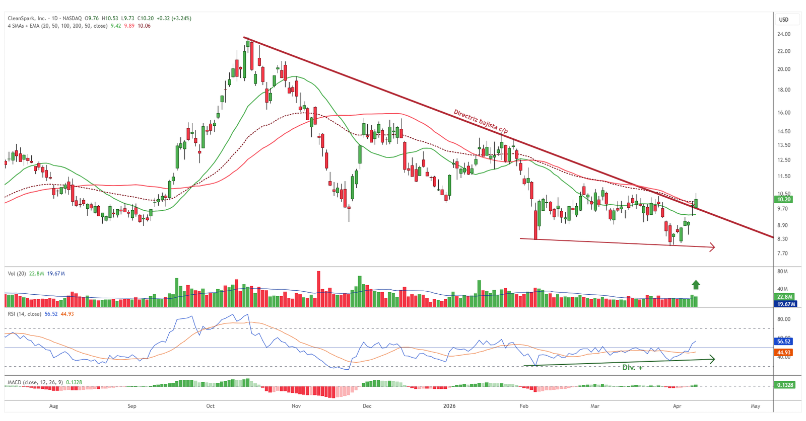 CleanSpark aparece como un valor a seguir tras mostrar una estructura muy similar a la de otros activos del sector. La ruptura de su directriz bajista, junto con la recuperación de medias móviles de corto plazo y un incremento claro de volumen, mejora su aspecto técnico. A esto se suman divergencias alcistas en el RSI que ya han empezado a reflejarse en el precio. Se trata de un escenario que, sin estar aún desarrollado por completo, empieza a llamar la atención dentro del radar de oportunidades.