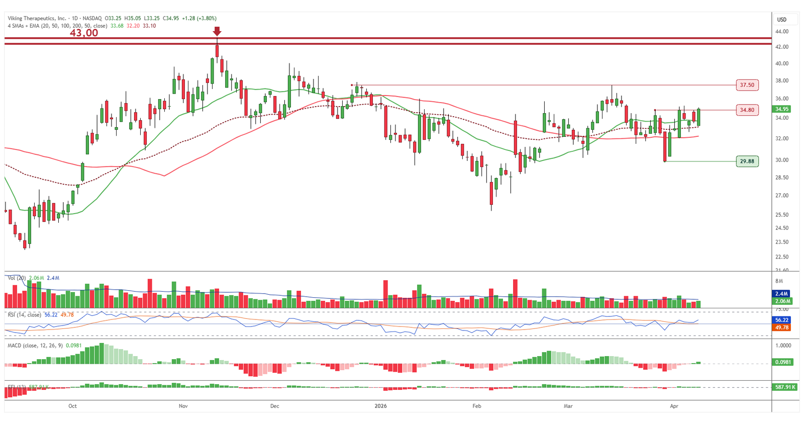 Viking Therapeutics vuelve a posicionarse por encima de una zona clave tras recuperar la resistencia de los 34,80 dólares y situarse nuevamente sobre sus medias móviles de corto plazo. El comportamiento del volumen, junto con un MACD ya en terreno positivo, acompaña este movimiento que empieza a mejorar su estructura. La zona de los 37,50 dólares aparece como siguiente referencia al alza, mientras que por abajo el soporte en los 29,88 dólares sigue siendo el nivel que define el escenario. La clave ahora pasa por confirmar si este impulso tiene continuidad.