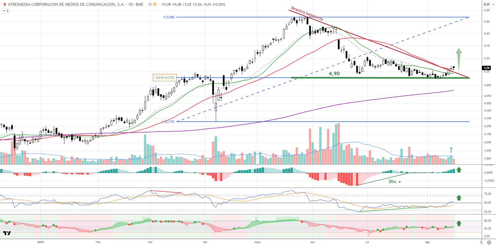 Atresmedia comienza a mostrar un comportamiento técnico muy interesante tras muchas semanas a la baja. El precio ha superado su directriz bajista de corto plazo y se apoya ahora en una zona de soporte sólida en los 4,90 euros, reforzada por un retroceso de Fibonacci del 61,8 %. Además, ha vuelto a situarse por encima de las medias móviles de 20 y 40 sesiones. La ruptura se acompaña de un notable incremento de volumen, lo que otorga fiabilidad al movimiento.