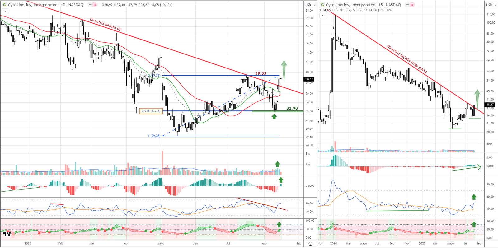 La farmacéutica estadounidense está mostrando un patrón técnico muy sólido tanto en gráfico semanal como diario. En la escala semanal, el precio ha conseguido superar su directriz bajista de largo plazo, acompañado de mínimos crecientes. En diario, el rebote parte desde un retroceso de Fibonacci del 61,8 %, dejando como soporte relevante la zona de los 33 dólares.
