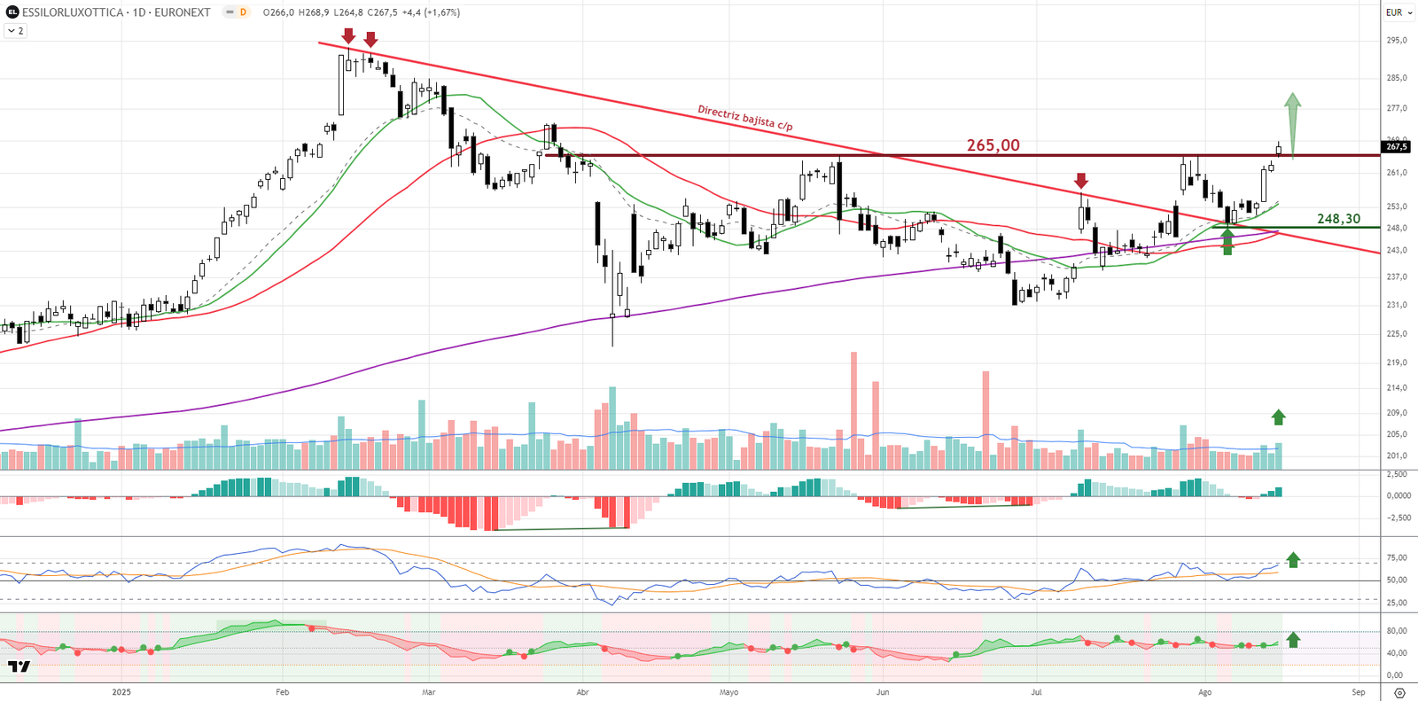 La multinacional franco-italiana ha ofrecido esta semana una señal técnica de gran potencia. Tras realizar un throwback a su antigua directriz bajista, el precio retoma el impulso y rompe al alza la resistencia de los 265 euros con un volumen claramente superior a la media. Ahora cotiza cómodamente por encima de las medias móviles de 20, 40 y también de la de 200 sesiones, que actúa como soporte dinámico.