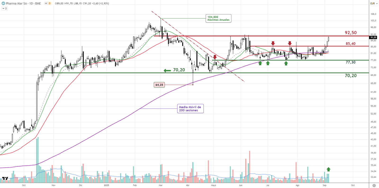 En este nuevo contenido abordamos con detalle el comportamiento técnico de PharmaMar, cuyo precio comienza a tomar distancia de sus medias móviles de largo plazo, apoyado por un volumen ascendente que refuerza la fiabilidad de la ruptura. Analizamos también los soportes clave, la resistencia más inmediata en 92,50 euros y el escenario potencial hacia los 140 euros, siempre desde una perspectiva basada en análisis técnico riguroso.