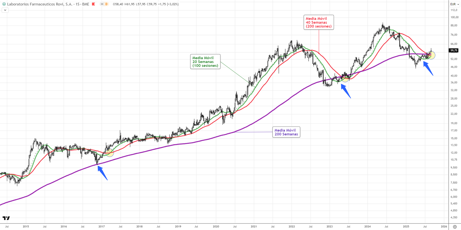 Rovi vuelve a destacar en el mercado tras activar una nueva idea de trading. El precio se apoya en la directriz alcista de largo plazo, confirmando su vigencia. Lo más destacado es la cercanía de un cruce de medias móviles (20 y 40 semanas), que históricamente ha sido precursor de tramos alcistas importantes. Este patrón, aunque no es un cruce dorado tradicional, refuerza la posibilidad de un movimiento sostenido al alza en el corto y medio plazo.