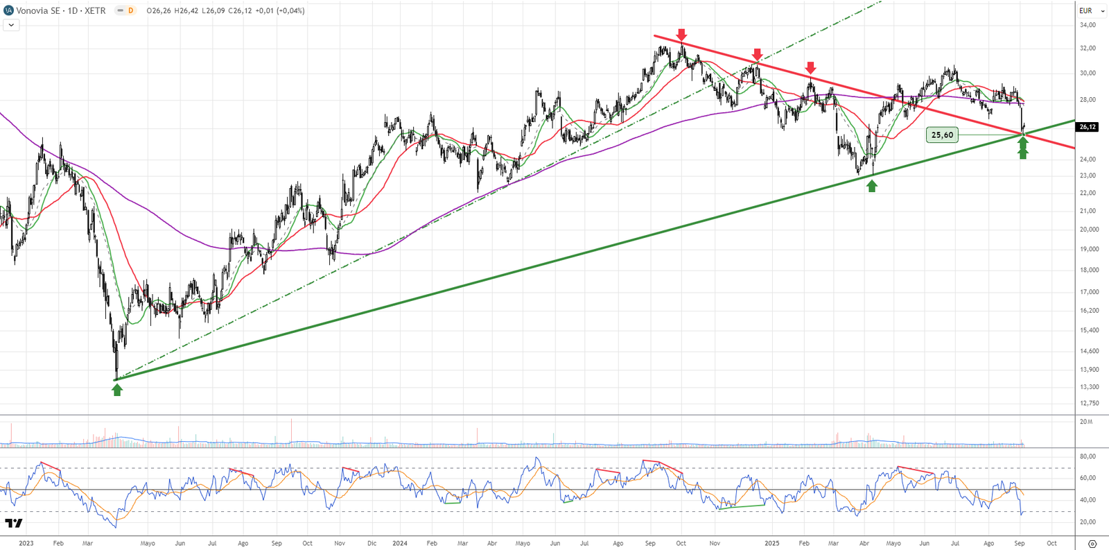 Vonovia ha generado una nueva oportunidad de entrada tras una caída pronunciada. El precio se ha apoyado en la confluencia de dos directrices —una bajista desde los máximos de 2023 y otra alcista desde los mínimos del mismo año— situadas en torno a los 25,60 euros. Desde ese punto, la acción ha dejado una vela martillo, señal de posible giro alcista, con un riesgo reducido y potencial de rebote si se mantiene sobre este nivel.