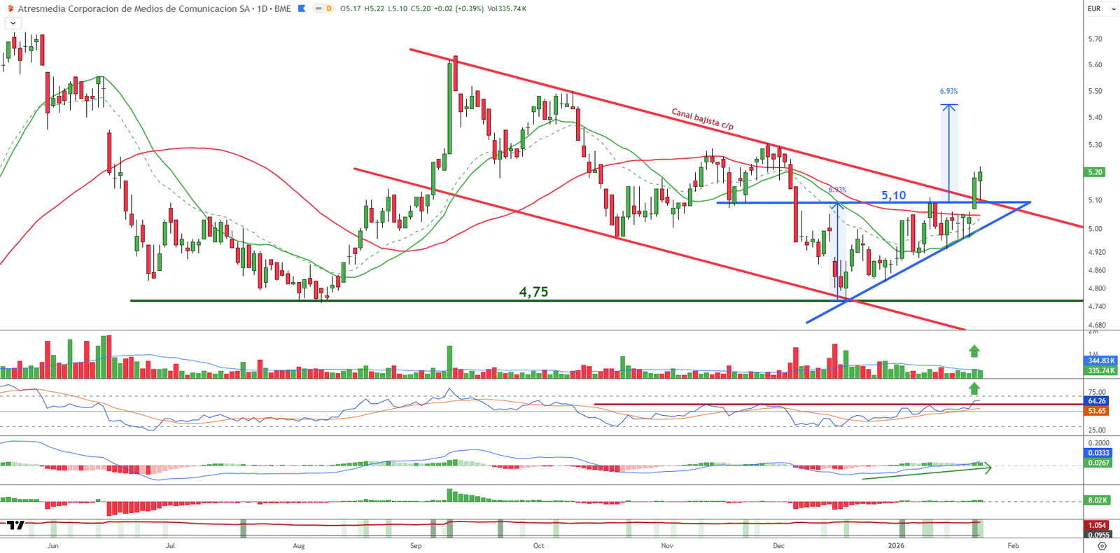 Uno de los datos técnicos más relevantes es la reciente superación de la SMA de 20 sesiones, situada actualmente en 38,61 USD. Este movimiento confirma un cambio en el momentum, fortaleciendo el comportamiento alcista del valor. Además, el MACD ha registrado un cruce positivo, y su histograma está virando hacia territorio alcista, lo que indica una alta probabilidad de continuidad en el impulso. A esto se suma un incremento en el volumen durante las sesiones de ruptura, validando la fuerza de los compradores en este tramo.