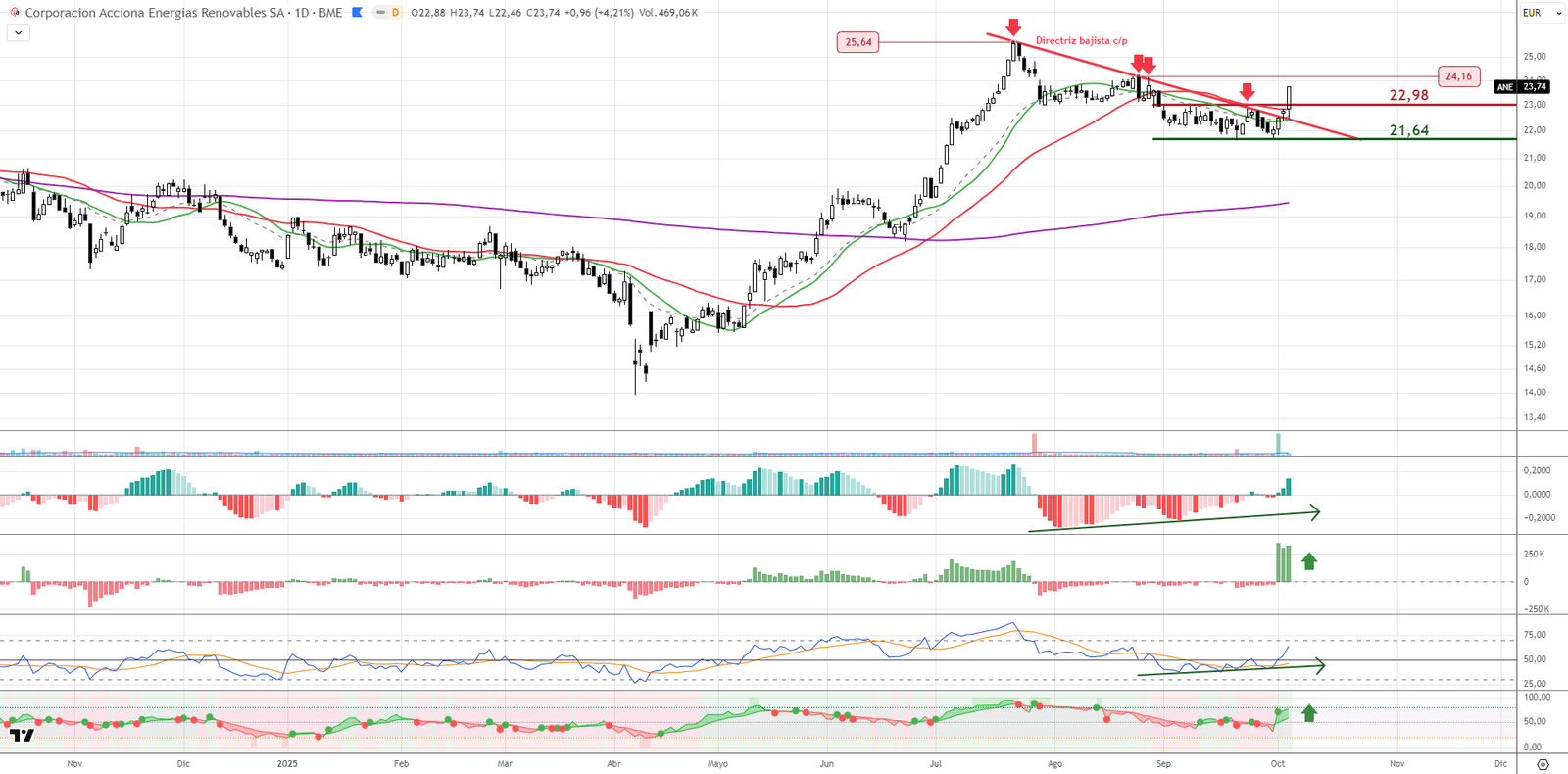 Acciona Energías confirma un giro al alza tras romper su directriz bajista inmediata y superar la resistencia clave de los 23 euros. La superación de las medias móviles refuerza la señal, con indicadores como MACD y RSI mostrando divergencias alcistas claras. El valor apunta a resistencias en 24,16 y 25,64 euros, y mantiene un soporte clave en los 21,64. Una idea técnica con gran potencial si se mantiene la presión compradora.