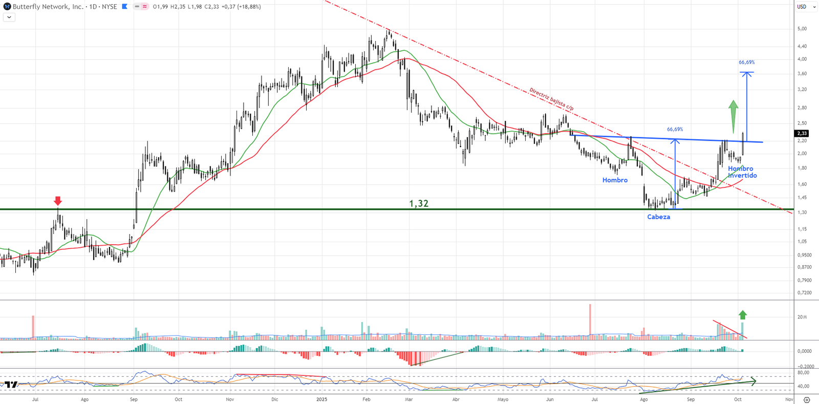 Incluida en nuestra Cartera USA como operativa especulativa, Butterfly Network muestra un posible Hombro-Cabeza-Hombro Invertido en formación. Ya registra un avance del +4% desde la entrada. Si se confirma la figura, el recorrido estimado supera el 60% adicional. Volumen creciente y reactivación clara en gráfico diario. Alta volatilidad pero gran proyección técnica.