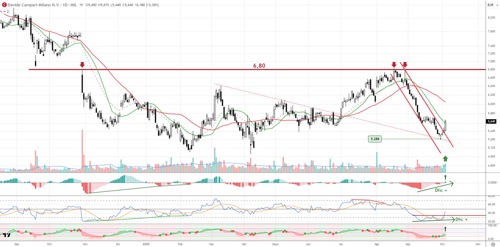 Campari rebota desde los 5,28 euros tras una fuerte sobreventa y ruptura de canal bajista. Recupera la media de 20 sesiones con fuerte volumen y activa señales técnicas favorables: MACD positivo y RSI al alza. Tiene margen de recuperación tras el correctivo de semanas anteriores. Una estructura de vuelta a seguir de cerca.