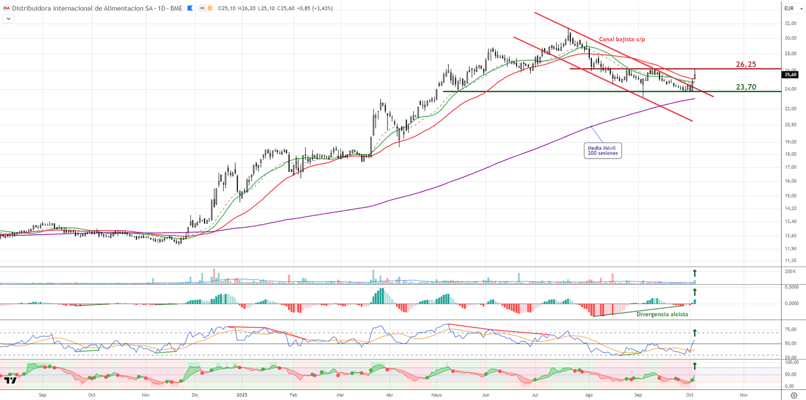 DIA rompe su canal bajista y realiza un primer intento sobre la resistencia de 26,25 euros con volumen creciente. Se apoya en la media de 200 sesiones y supera también las de corto plazo. Los indicadores técnicos refuerzan el rebote con un RSI al alza y un MACD con divergencia. Si confirma la ruptura en cierres, podría activar una operativa al alza con stop ajustado bajo los 23,70 euros. Valor a vigilar en próximas sesiones.