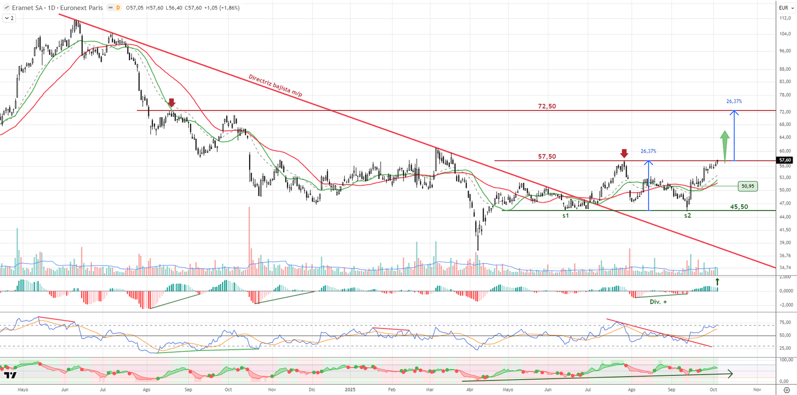 Eramet rompe la resistencia de 57,50 euros, activando un patrón de doble suelo con objetivo en los 72,50 euros. El MACD es creciente y el RSI entra en zona de fortaleza. El flujo de capital se incrementa, confirmando presión compradora. Valor con proyección técnica clara y potencial alcista a corto-medio plazo.