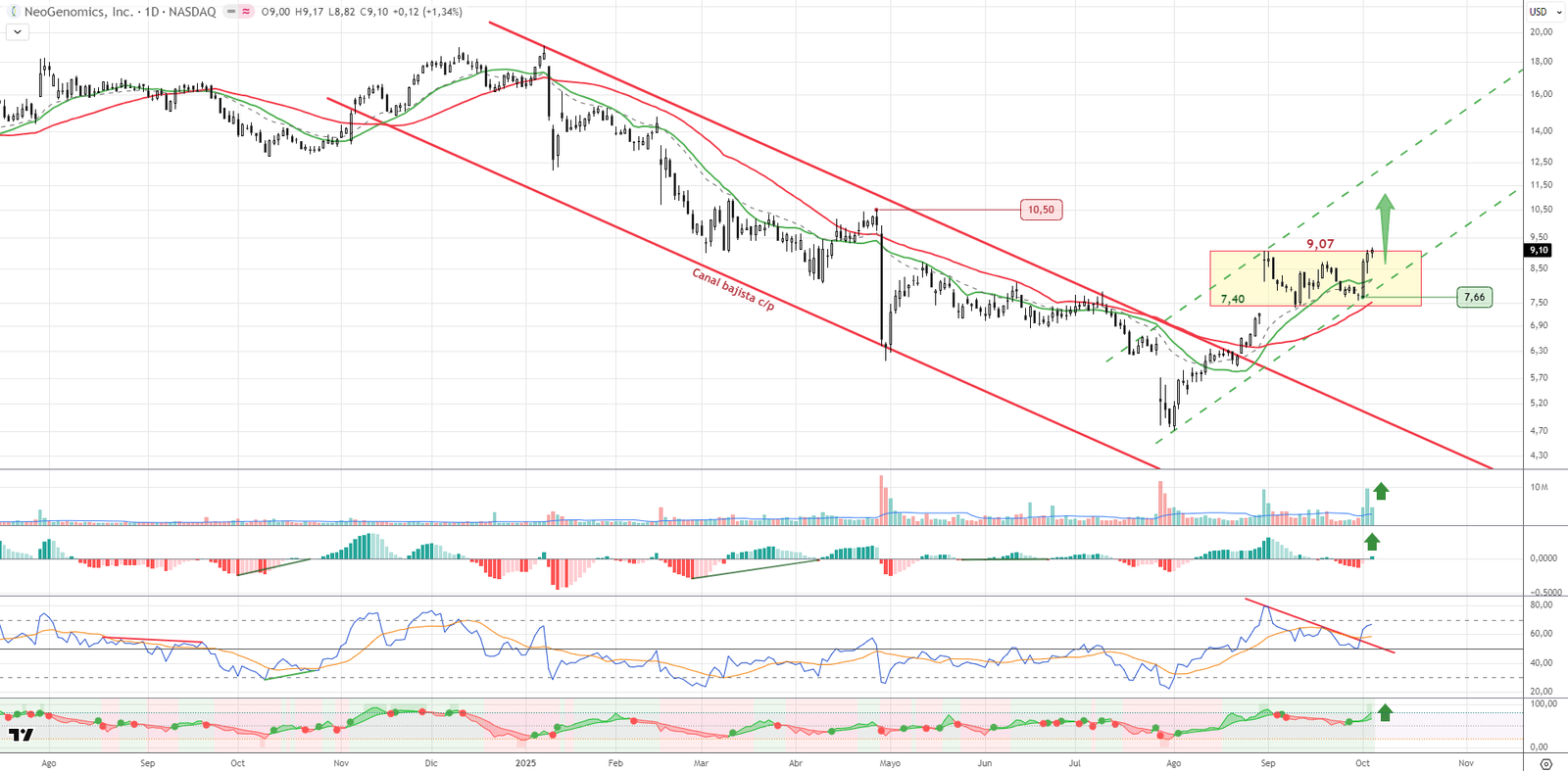 NeoGenomics rebota con volumen desde los 7,40 dólares y supera la resistencia de los 9 dólares. Presenta siguiente obstáculo en 10,50, con indicadores favorables y presión compradora en aumento. Ideal para operativa con perfil más especulativo, manteniendo stop por debajo de los 7,66 dólares. Estructura de giro con buen aspecto técnico.