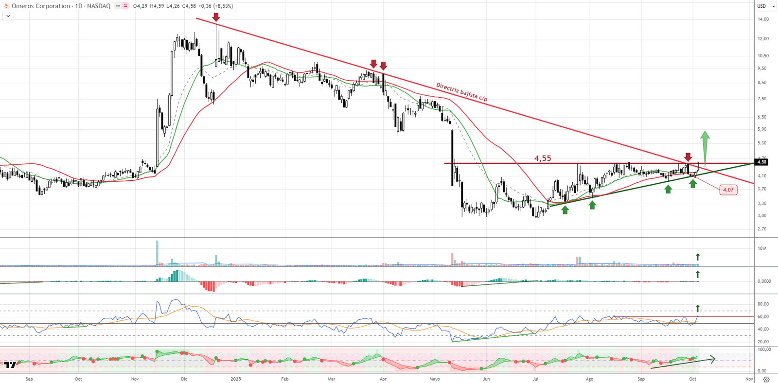 Omeros rompe directriz bajista y supera los 4,55 dólares, confirmando una figura triangular alcista. Soporte clave en los 4,07 dólares. Técnica limpia y volumen acompañando. Perfil de riesgo alto, pero con buena construcción de vuelta. Alternativa para perfiles agresivos.