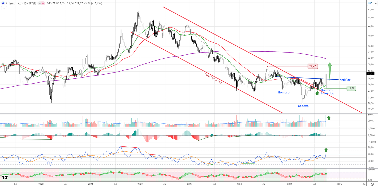 Pfizer rompe al alza un canal bajista de medio plazo y activa una figura de HCHi semanal, con una subida del +15%. Supera medias de 100 y 200 sesiones, con indicadores alineados al alza. RSI, MACD y flujo de capital apoyan el movimiento. Valor para entrar en retrocesos hacia los 26,50 dólares, con soporte en 23,58.