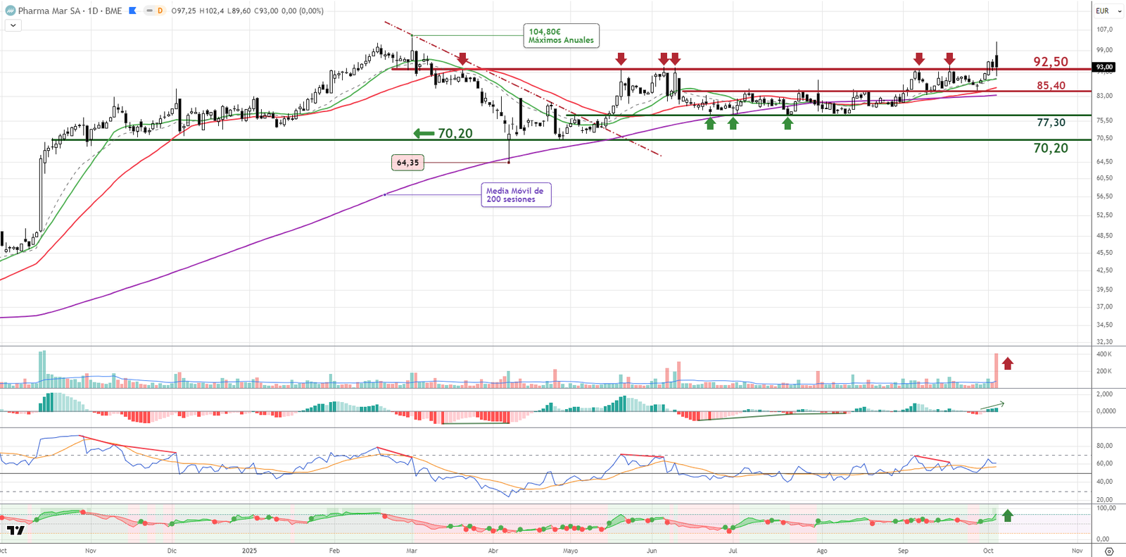 PharmaMar supera la resistencia de 92,50 euros con volumen, y mantiene una proyección técnica de fondo hacia los 139-140 euros, dentro de una figura de triángulo simétrico rota al alza. El RSI y MACD confirman la fortaleza. Esta semana sube un +7,5% y acompaña el volumen más alto de los últimos meses. Primeros objetivos en los 104,80-105,80 euros. Una estructura alcista firme que sigue activa en nuestra Cartera Euro.