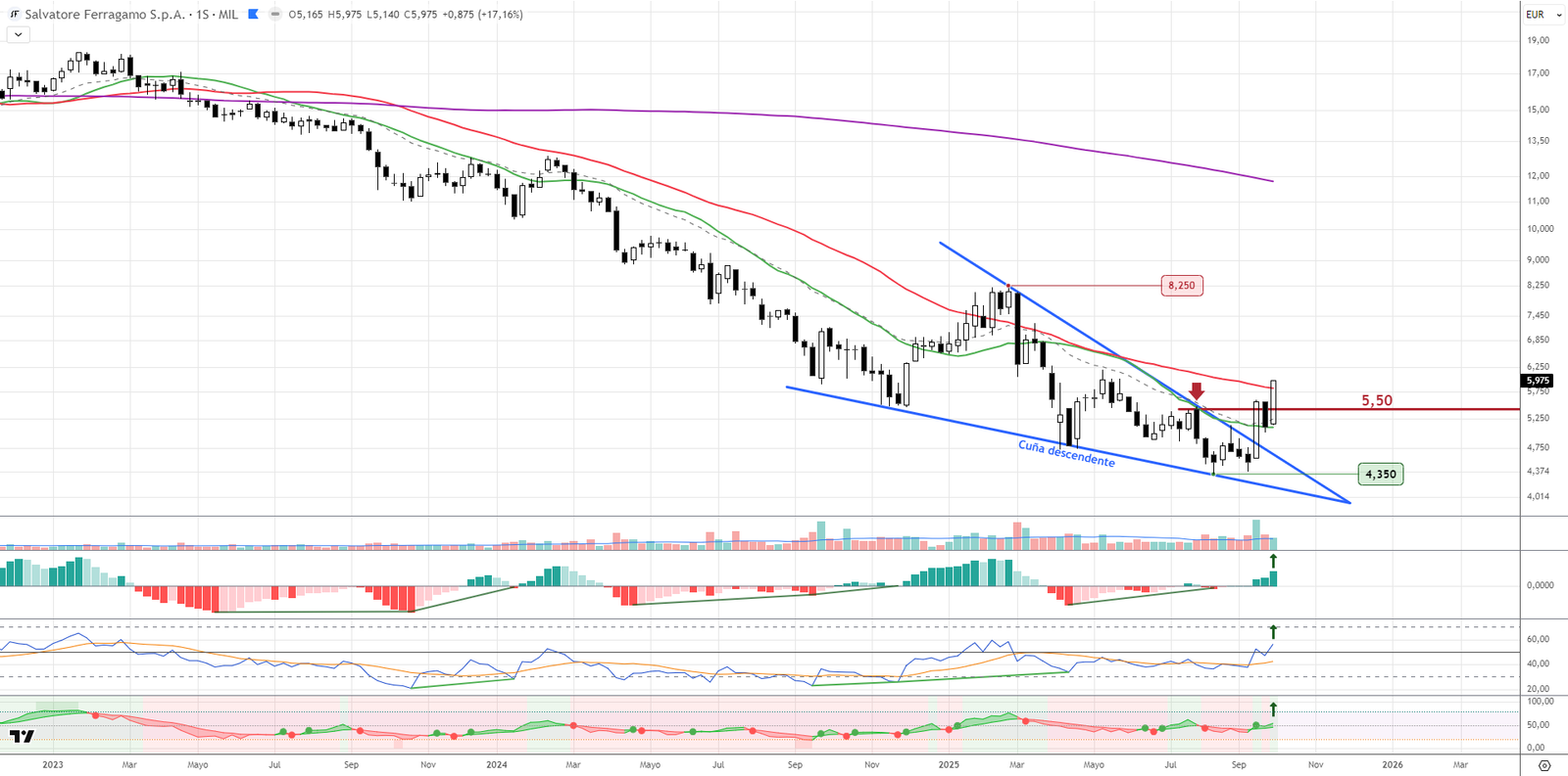 Ferragamo rompe al alza una figura de cuña descendente, con subida acumulada superior al 17% semanal. El precio apunta a resistencias en los 6,25 y 8,25 euros, tras haber superado las medias de largo plazo. En nuestra Cartera Euro la posición ya acumula un +12%, y pronto realizaremos el primer parcial. Estructura técnica potente, clara y con objetivos definidos.