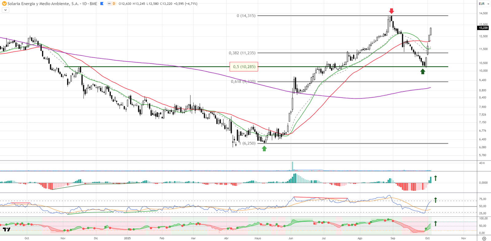 Solaria rebota desde el 50% de retroceso de Fibonacci del anterior tramo alcista, dejando una estructura de vuelta técnica muy bien definida. El impulso ha sido validado con ruptura de medias móviles de 20 y 40 sesiones y acompañamiento de indicadores técnicos. El precio apunta hacia la zona de máximos anuales en 14,30 euros, con fuerte apoyo en el volumen y la presión compradora. Una operación con gran recorrido técnico y clara estructura.