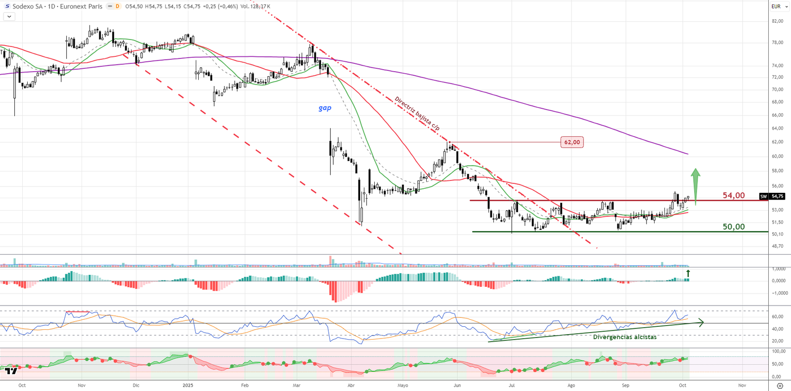 Sodexo rompe un largo lateral superando los 54 euros y dejando atrás una fase bajista de fondo. El soporte clave queda en 50 euros, y los objetivos técnicos se sitúan en la media de 200 sesiones o los 62 euros. El RSI lleva meses mostrando divergencias alcistas respecto al precio, anticipando este movimiento. Una operación técnica de alta calidad.