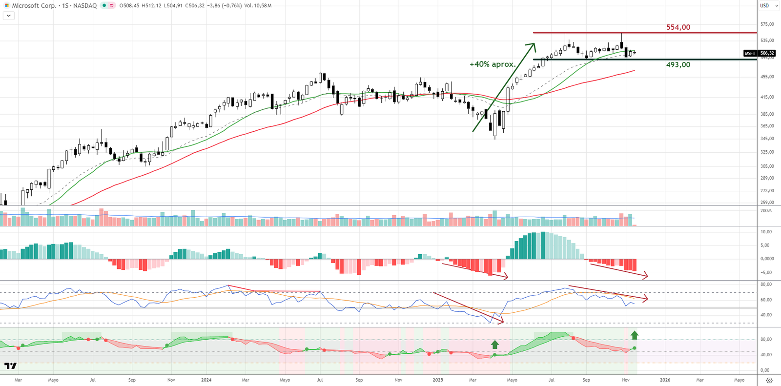 Microsoft continúa dentro de un amplio rango lateral que ha definido sus movimientos en los últimos meses. La proximidad al soporte inferior del rango sitúa a la acción en un punto de decisión importante. Lo más interesante aparece en los indicadores, ya que el RSI y el MACD mantienen un sesgo bajista mientras el MFI comienza a girarse al alza. Este comportamiento sugiere una entrada temprana de flujo de capital, un patrón que ya se produjo previamente antes de un tramo alcista relevante. El análisis del comportamiento del volumen y del precio típico aporta pistas sobre un posible cambio de tendencia si el soporte aguanta en próximas sesiones.