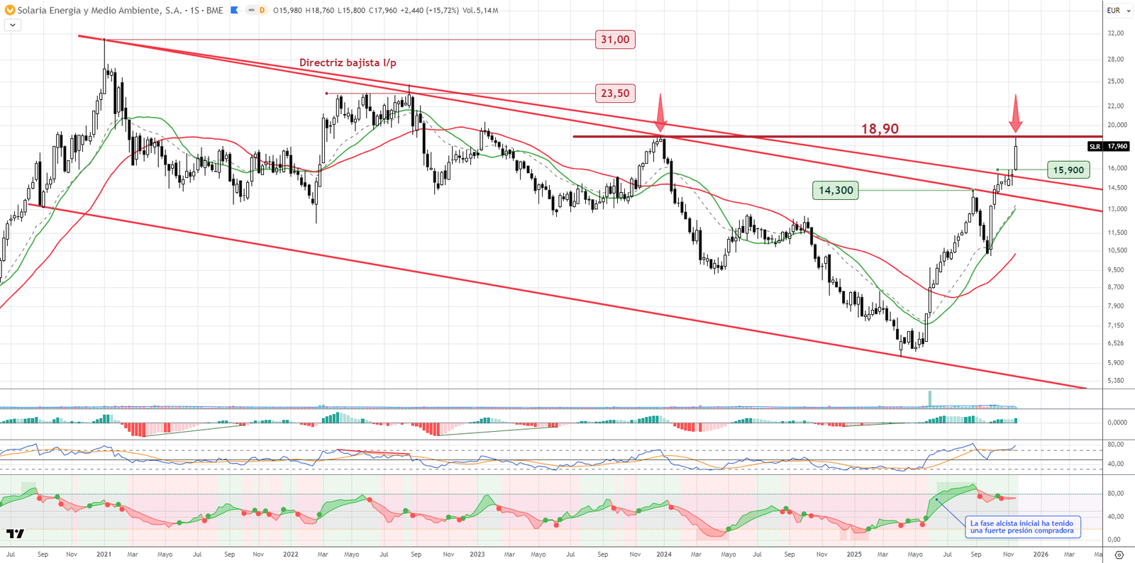 Solaria ha protagonizado un movimiento muy destacado tras presentar unos resultados que han superado ampliamente las estimaciones del consenso. El notable crecimiento del EBITDA y del beneficio neto ha generado una reacción contundente que se ha reflejado en una subida abrupta, incluso en una jornada claramente bajista para el IBEX. La compañía ha presentado además un plan estratégico ambicioso que implica una expansión internacional, una entrada decisiva en el negocio de centros de datos y una apuesta por el almacenamiento energético. Técnicamente, la acción se enfrenta a una resistencia relevante tras un rally que la ha llevado a multiplicar su precio desde los mínimos de abril. La superación de dicha zona podría abrir la puerta a niveles superiores, mientras que los soportes cercanos permiten evaluar el riesgo con mayor precisión.