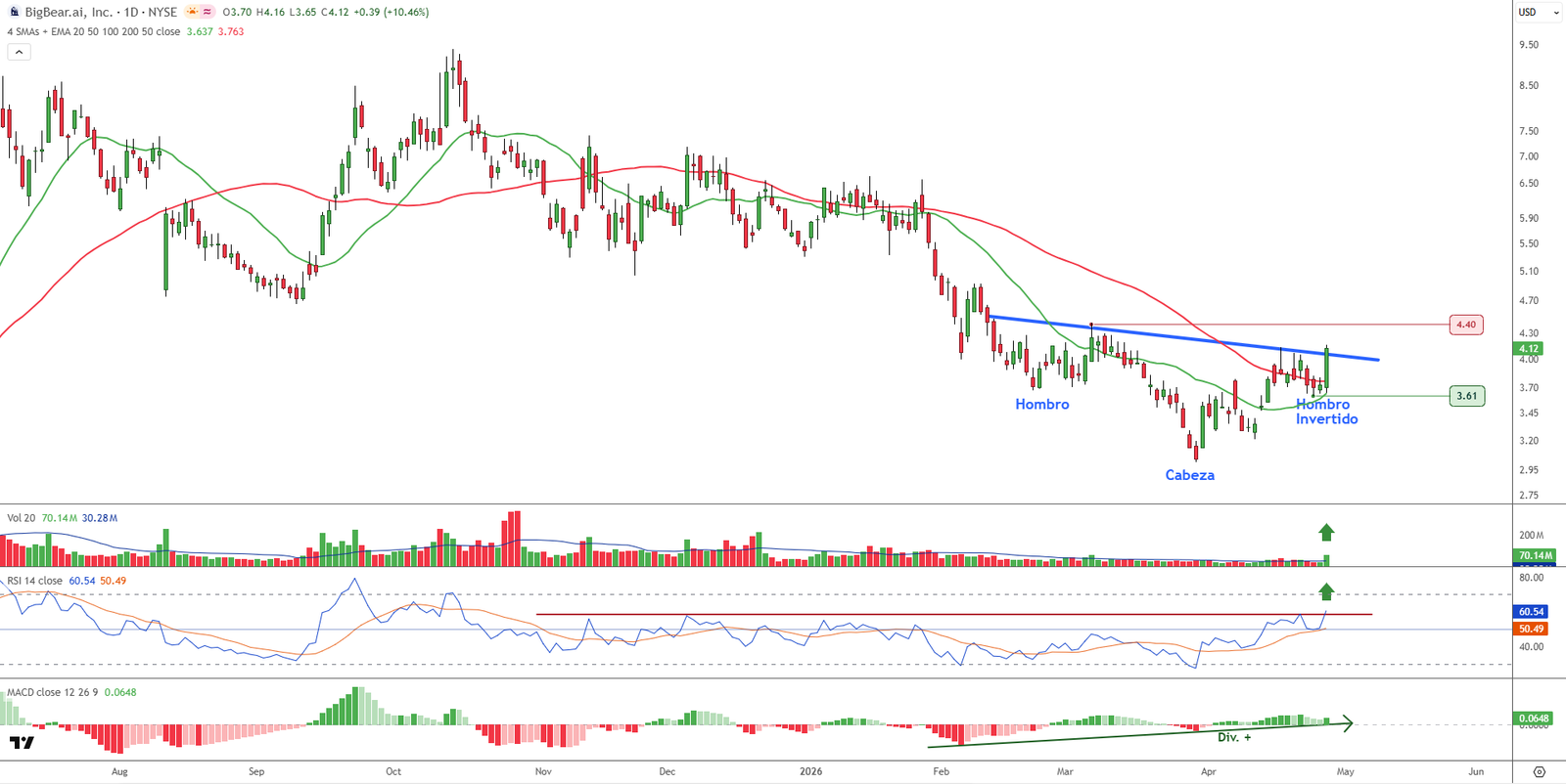 La cotización también ha superado las medias móviles de 20 y 50 sesiones, que comienzan a girarse al alza, mejorando la estructura de corto plazo. A esto se suma un RSI fuerte, situado en zona de máximos recientes, y un MACD que mantiene divergencias alcistas. La referencia inmediata por arriba queda en los 4,40 dólares, mientras que el soporte más cercano se sitúa en los 3,61 dólares, nivel bajo el cual se colocará el stop de protección.