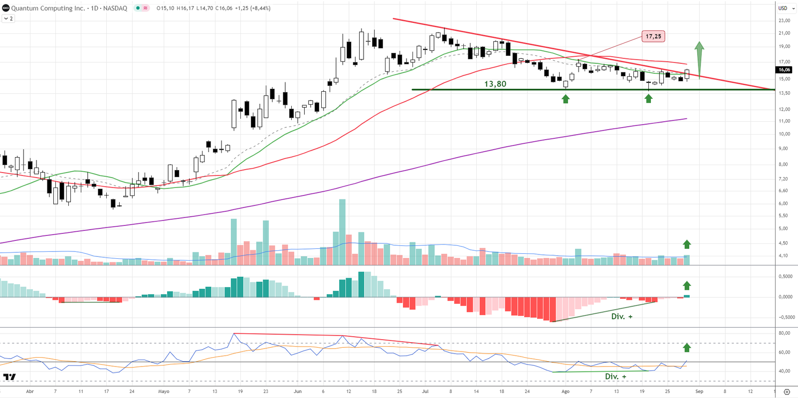 Este valor ultra especulativo ha roto su directriz bajista con fuerza y volumen. La superación de la media de 20 sesiones y las divergencias alcistas en MACD y RSI sugieren un potencial movimiento hacia los 17 dólares, donde se encuentra la próxima resistencia clave. Aunque el timing ideal de entrada era antes del cierre, su aspecto técnico es sólido para perfiles agresivos. Muy similar al caso de Grenergy, pero con señales incluso más fuertes.