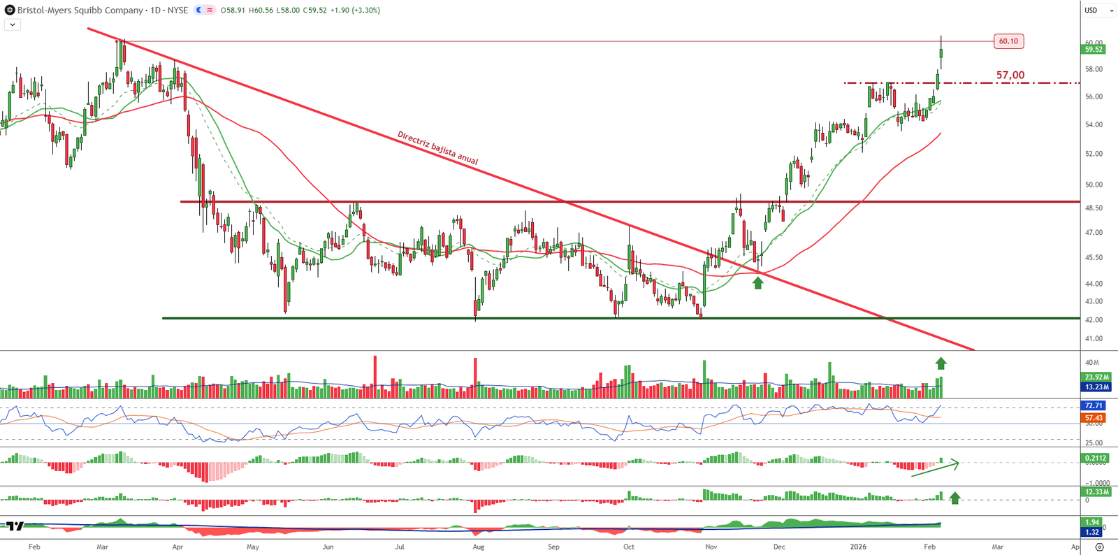 Bristol-Myers Squibb ha reaccionado con fuerza tras presentar resultados que han superado expectativas, encadenando varias sesiones consecutivas al alza. Este movimiento se ha producido con un volumen claramente superior a la media, confirmando la fortaleza del impulso.