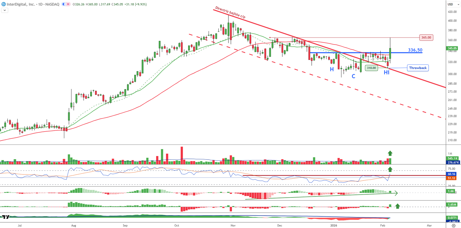 InterDigital muestra uno de los aspectos técnicos más interesantes tras la publicación de resultados. El valor ha conseguido romper su directriz bajista de corto plazo y, tras una breve fase de consolidación, ha completado un movimiento que le ha permitido superar con claridad una resistencia clave, actuando esta como neckline de una figura de Hombro-Cabeza-Hombro invertido.