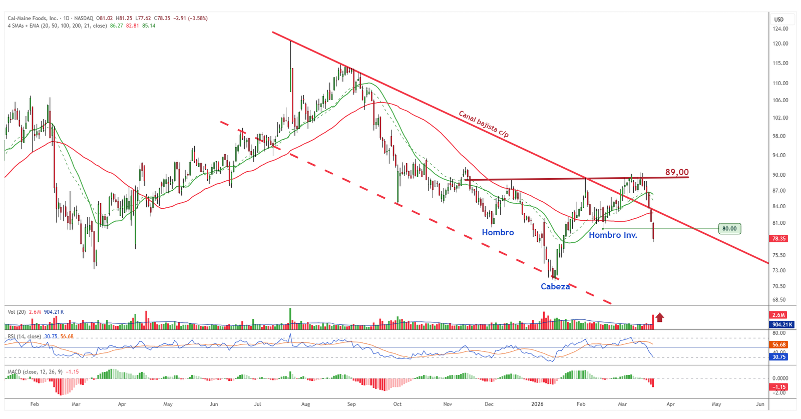El valor ha pasado de una estructura prometedora a un deterioro claro en cuestión de sesiones. La incapacidad para confirmar la ruptura en la zona de los 89 dólares ha terminado derivando en un movimiento bajista que ha ido ganando intensidad, con pérdida de medias móviles y del soporte en los 80 dólares. El stop-loss se ejecuta en un contexto técnico ya desfavorable, lo que confirma el giro del escenario. Una situación que en el gráfico se aprecia con bastante claridad al revisar la secuencia reciente del precio.