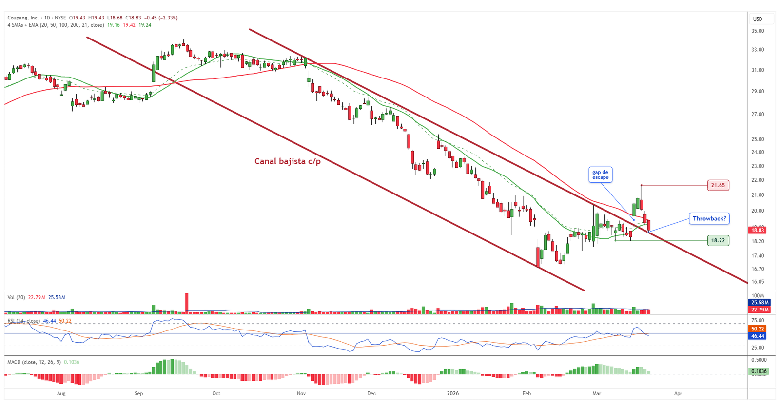 Tras un buen inicio de semana, el valor ha entrado en fase correctiva, completando tanto el throwback como el cierre del gap de escape. Este ajuste deja al precio en una situación más ordenada desde el punto de vista técnico, con el soporte de los 18,22 dólares como referencia clave. La reacción en este nivel marcará el próximo escenario, ya sea en forma de rebote o de continuidad bajista.