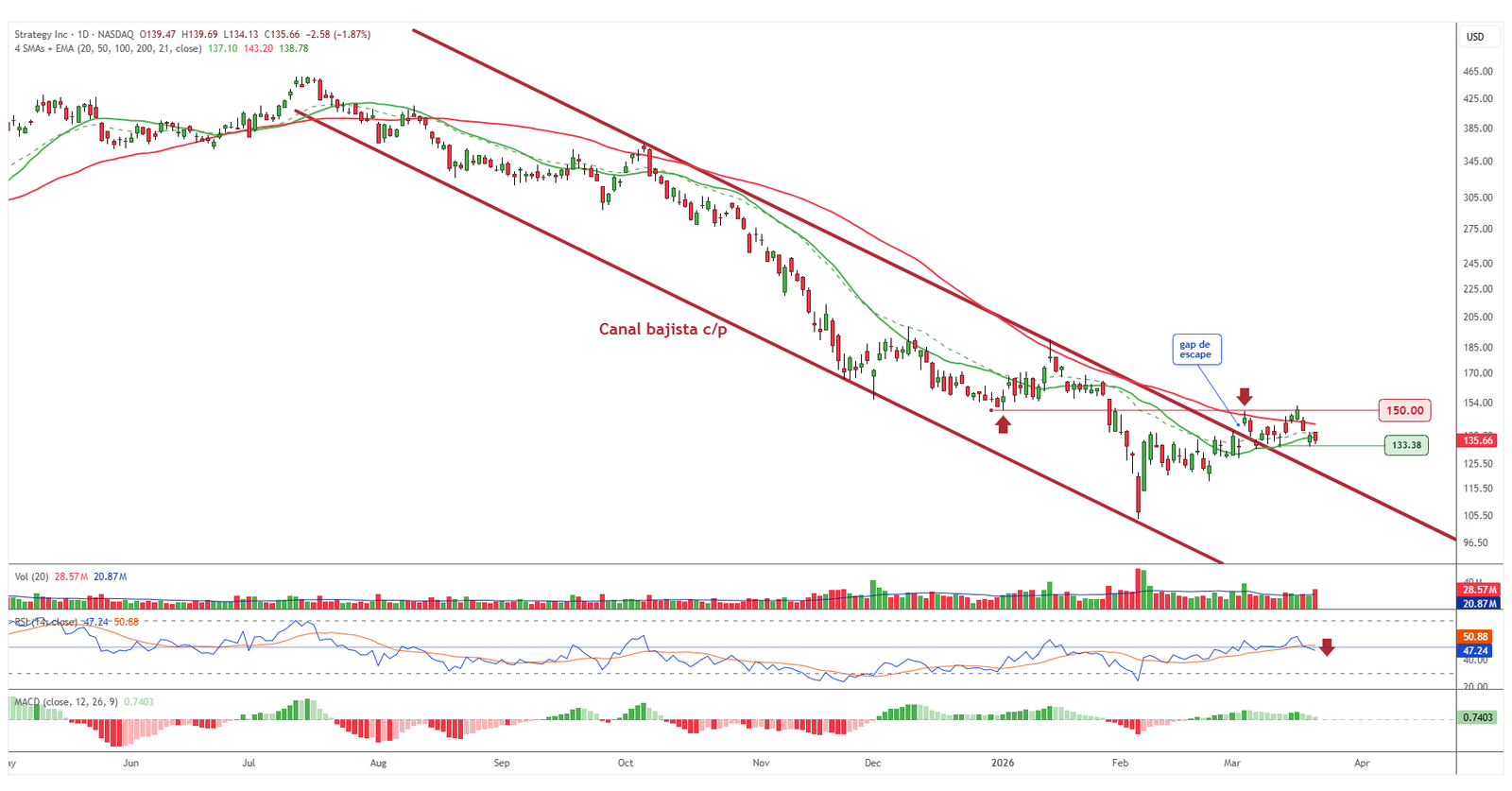 Strategy se mantiene en un rango lateral bien definido, con soporte en los 133,38 y resistencia en los 150 dólares. A pesar de la debilidad general del mercado, el valor ha conseguido sostener este nivel en varias sesiones, lo que reduce el riesgo inmediato. Sin embargo, la convergencia de medias móviles sugiere que podría estar gestándose un movimiento de mayor intensidad. El desenlace de este rango será determinante para el corto plazo.