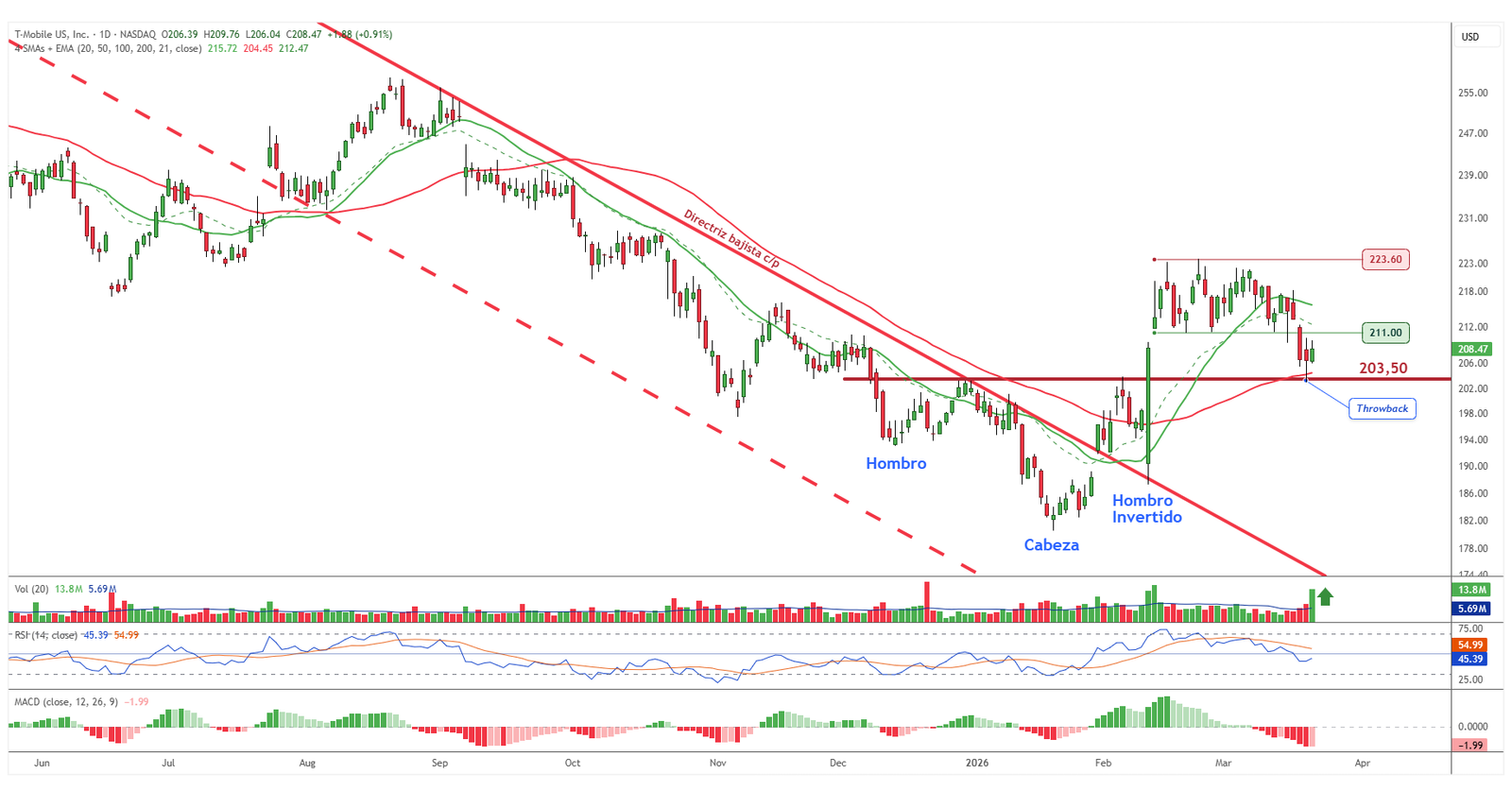 En un entorno complicado, T-Mobile destaca por su fortaleza relativa. El precio ha completado un throwback hacia la zona de los 203,50 dólares, ahora convertida en soporte, reforzada además por la media móvil de 50 sesiones. Mientras este nivel se mantenga, la estructura sigue siendo favorable, con un patrón de giro que continúa vigente. Un comportamiento que contrasta con el resto del mercado y que merece especial atención.