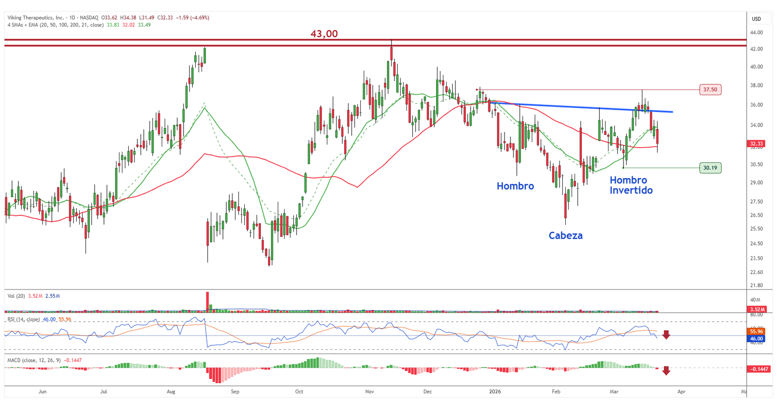 El valor ha perdido tracción tras una semana débil y comienza a acercarse a niveles relevantes. La zona de los 30,19 dólares se convierte en el principal soporte a vigilar, ya que su pérdida comprometería la estructura alcista previa. Los indicadores acompañan este enfriamiento, reflejando una pérdida de impulso. El escenario se vuelve más delicado, y la reacción en este nivel será clave para definir el siguiente movimiento.