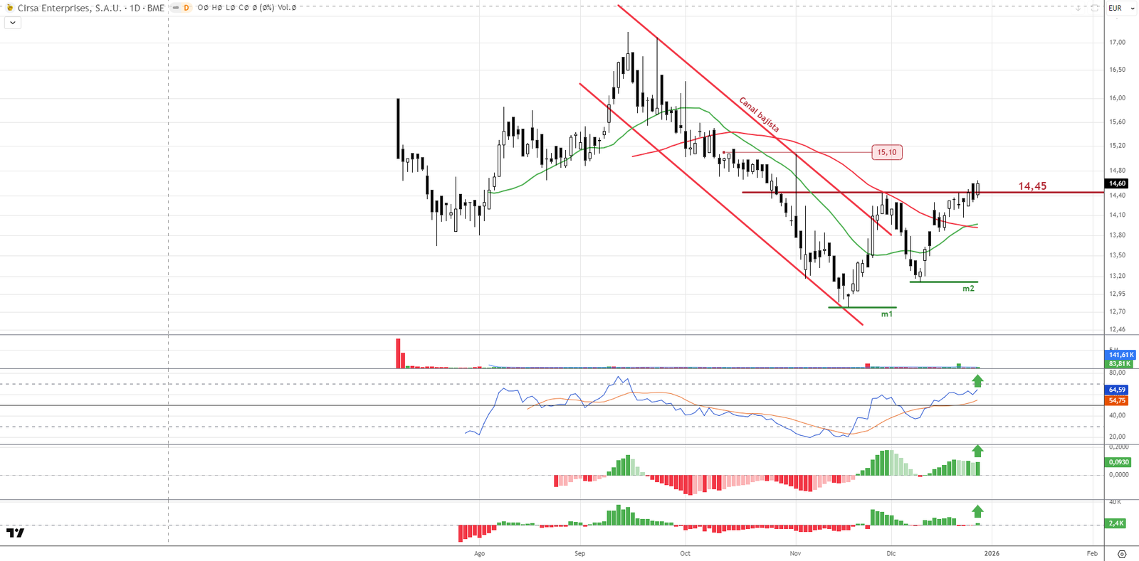 Cirsa confirma una ruptura relevante tras salir de su canal bajista y superar una resistencia situada entre dos mínimos crecientes. Esta configuración técnica suele ser una de las primeras señales de cambio de dinámica, especialmente cuando viene acompañada de un cruce alcista de medias móviles y de indicadores que se mantienen en terreno positivo.