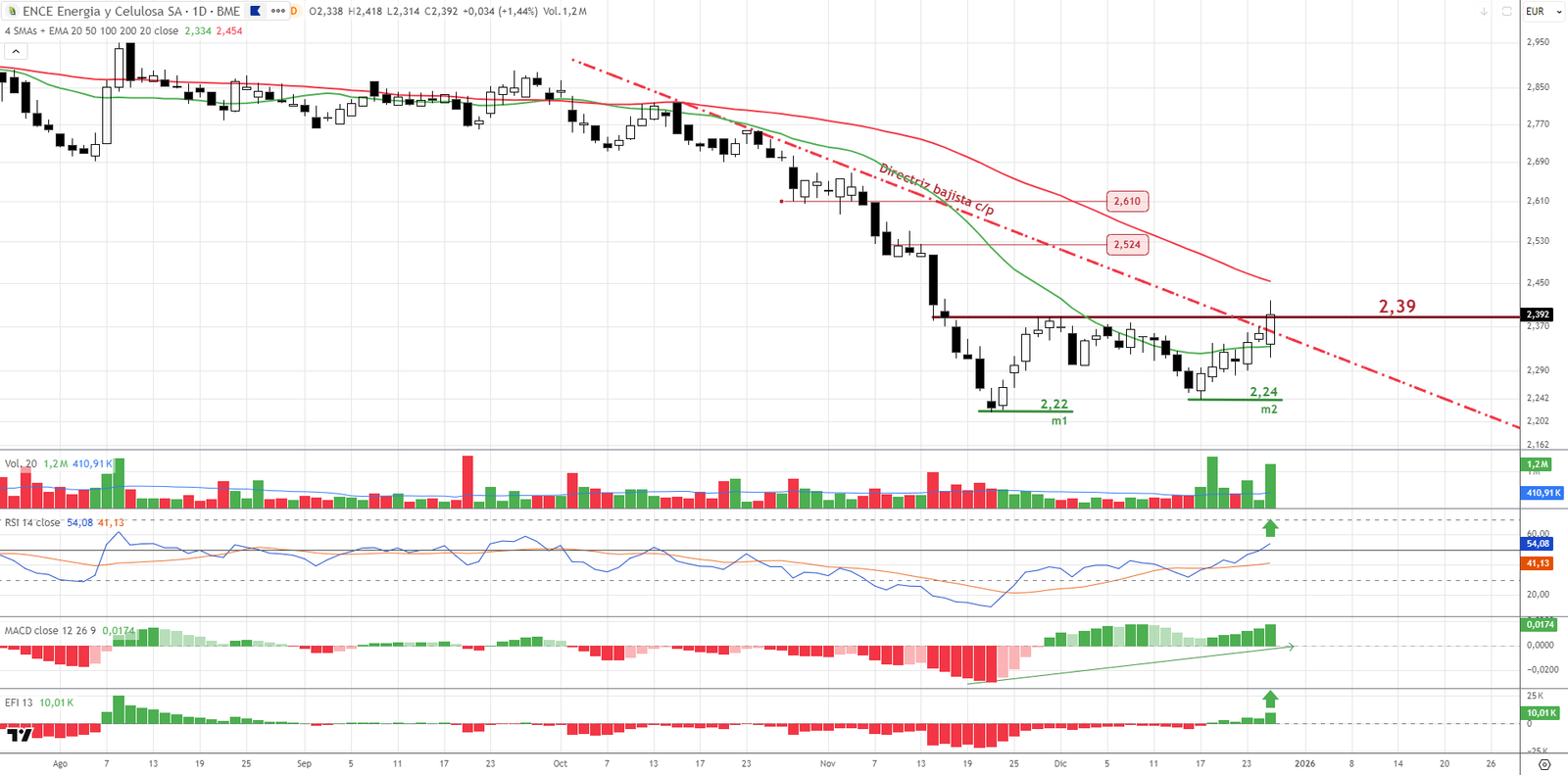 Ence presenta una de las mejoras técnicas más claras de las últimas sesiones. El valor ha conseguido superar una resistencia relevante y situarse por encima de la media móvil de corto plazo, lo que supone un primer paso importante tras un tramo claramente bajista. Este movimiento se ha producido acompañado de un aumento significativo del volumen, un factor clave que aporta mayor fiabilidad a la ruptura.
