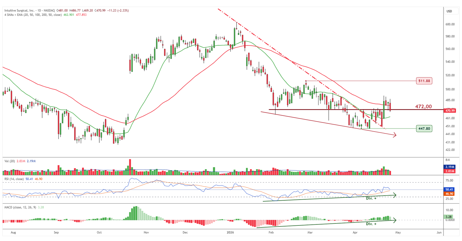 Intuitive Surgical fue el punto más delicado de la sesión. El valor retrocedió más de un 2% y cerró por debajo de referencias importantes, entre ellas la media de 50 sesiones y la zona de soporte situada en torno a los 472 dólares. Esta pérdida de niveles no obliga por sí sola a tomar una decisión inmediata, pero sí introduce una señal de debilidad que conviene seguir muy de cerca.