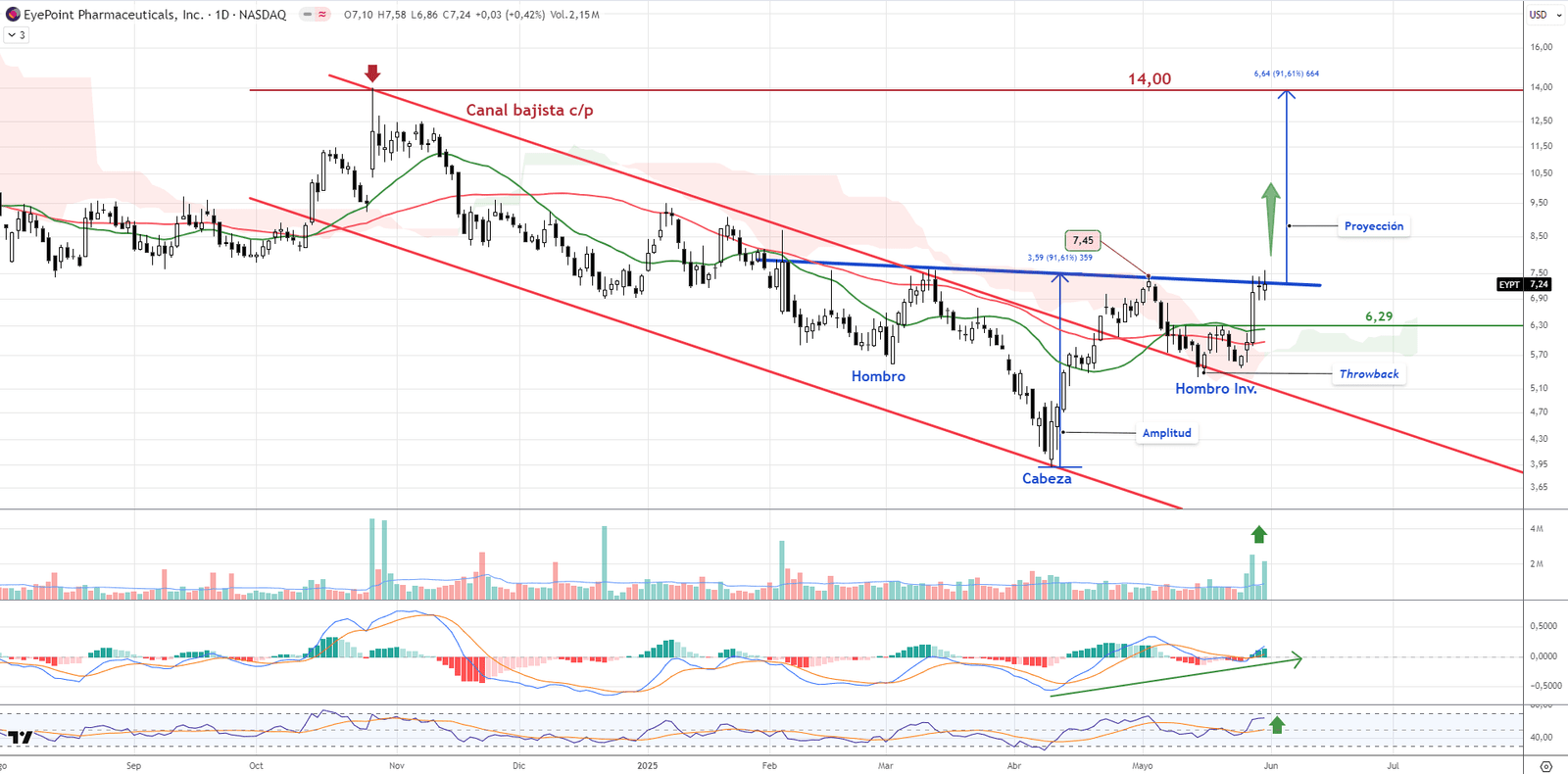 EyePoint Pharmaceuticals ha perforado resistencias menores en los 6,29 dólares, estableciendo un soporte importante en ese nivel. El patrón técnico más relevante es un Hombro-Cabeza-Hombro invertido que proyectaría un objetivo potencial en torno a los 14 dólares.
