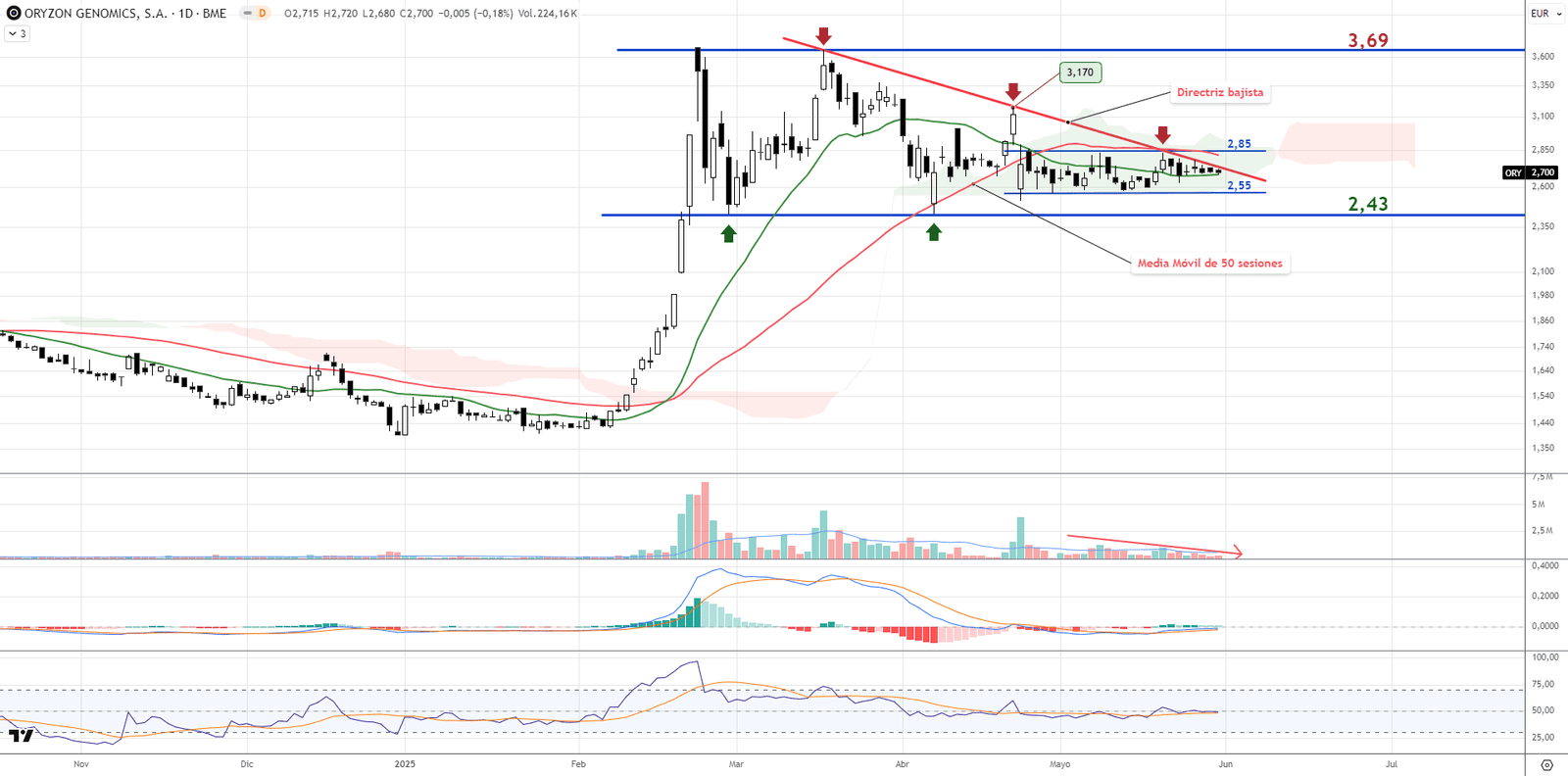Oryzon Genomics se encuentra testeando su directriz bajista más inmediata, con el precio moviéndose en un rango estrecho entre los 2,55 y los 2,85 euros. El gráfico sugiere una resolución inminente que podría derivar en un movimiento explosivo.