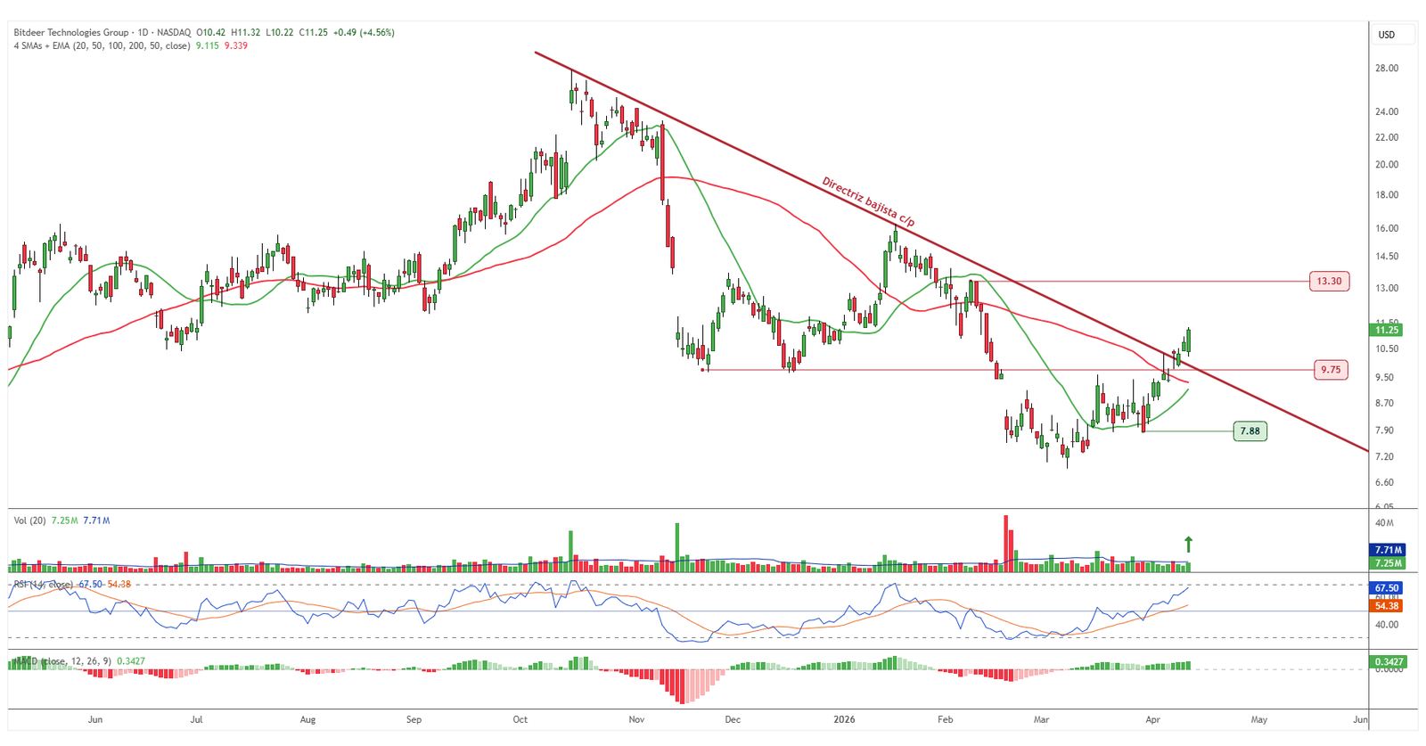 Bitdeer Technologies se posiciona como uno de los valores más fuertes de la cartera tras una recuperación sólida desde apertura bajista. El precio se mantiene por encima de sus referencias de corto plazo y sigue alejándose de su anterior estructura correctiva, lo que refuerza el sesgo positivo. El siguiente nivel relevante aparece por encima, dejando margen para que el movimiento pueda seguir desarrollándose.