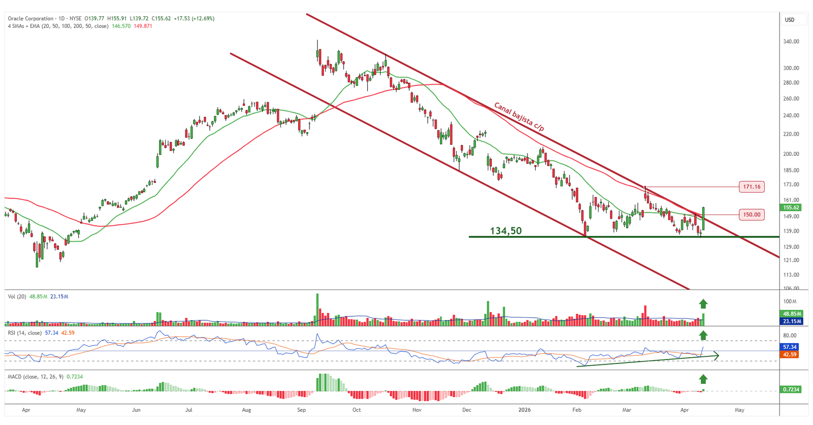 Oracle comienza a ofrecer señales de recuperación tras un periodo de debilidad y dudas en torno a su estructura. La ruptura de su canal bajista y la superación de niveles clave con volumen devuelven al valor a una fase más constructiva. A esto se suma la mejora en sus indicadores y la recuperación de medias relevantes, lo que sitúa al activo en un punto técnico especialmente interesante de cara a próximas decisiones.