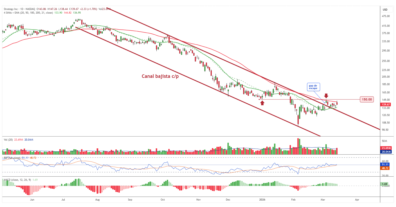 El gráfico de Strategy presenta una situación especialmente interesante desde el punto de vista técnico. El valor ha conseguido superar su canal bajista de corto plazo mediante un gap al alza, lo que reduce la presión vendedora dominante en la fase anterior. Sin embargo, la media móvil simple de 50 sesiones continúa actuando como una resistencia relevante que el precio todavía no ha conseguido superar de forma sostenida. Esta zona podría convertirse en un punto decisivo para determinar si el movimiento de recuperación gana continuidad o si el valor necesita más tiempo de consolidación. La evolución del precio en torno a este nivel será clave en las próximas sesiones.