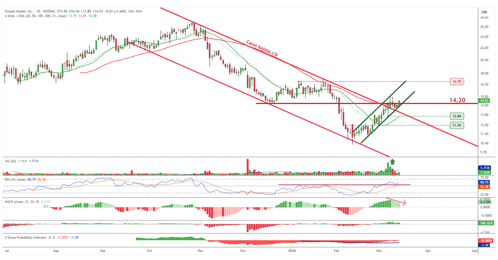 Las acciones de Omada Health comienzan a mostrar una mejora clara en su estructura técnica tras abandonar su canal bajista de corto plazo. El precio ha logrado situarse por encima de la media móvil de 50 sesiones y también superar la zona de resistencia situada en los 14,20 dólares, un nivel que ahora pasa a ser una referencia importante en el gráfico. A esto se suma un aumento del volumen durante la ruptura y una lectura favorable en los indicadores, con un RSI que mantiene fortaleza y un MACD situado en terreno positivo. La estructura sugiere un escenario de recuperación en desarrollo, aunque conviene observar con atención cómo evoluciona el precio en las próximas sesiones.