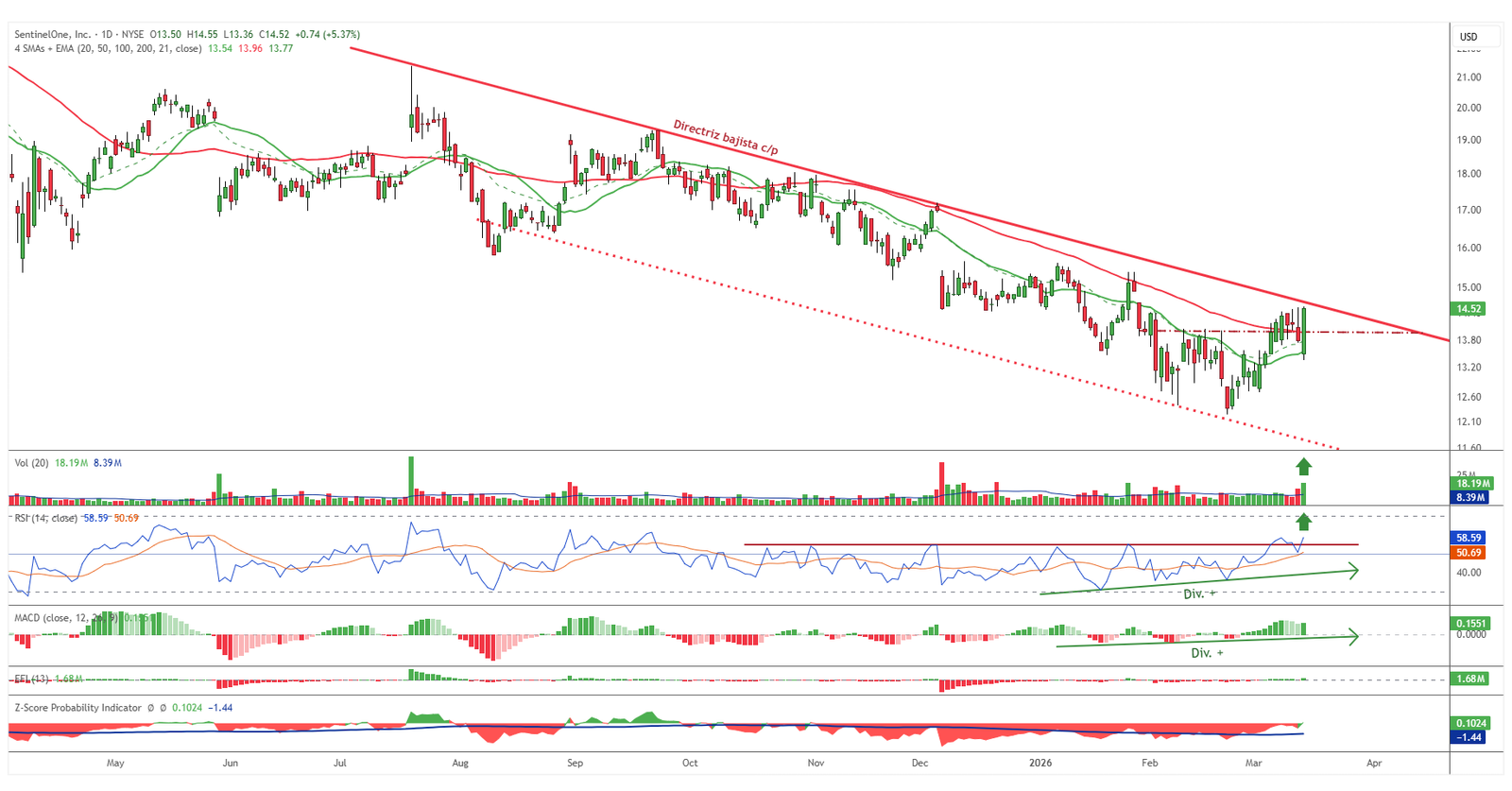 En el caso de SentinelOne, el gráfico refleja una reacción interesante desde el soporte histórico situado en la zona de los 12,50 dólares. Desde ese punto el valor ha encadenado varias semanas consecutivas de recuperación, lo que ha permitido aliviar parcialmente la presión bajista que venía dominando la estructura previa. El precio comienza ahora a aproximarse a su directriz bajista más inmediata, reforzada además por la media de 20 periodos en gráfico semanal. Las divergencias alcistas observadas en indicadores como el RSI o el MACD aportan un elemento adicional a vigilar, especialmente si el precio logra consolidar el impulso actual.