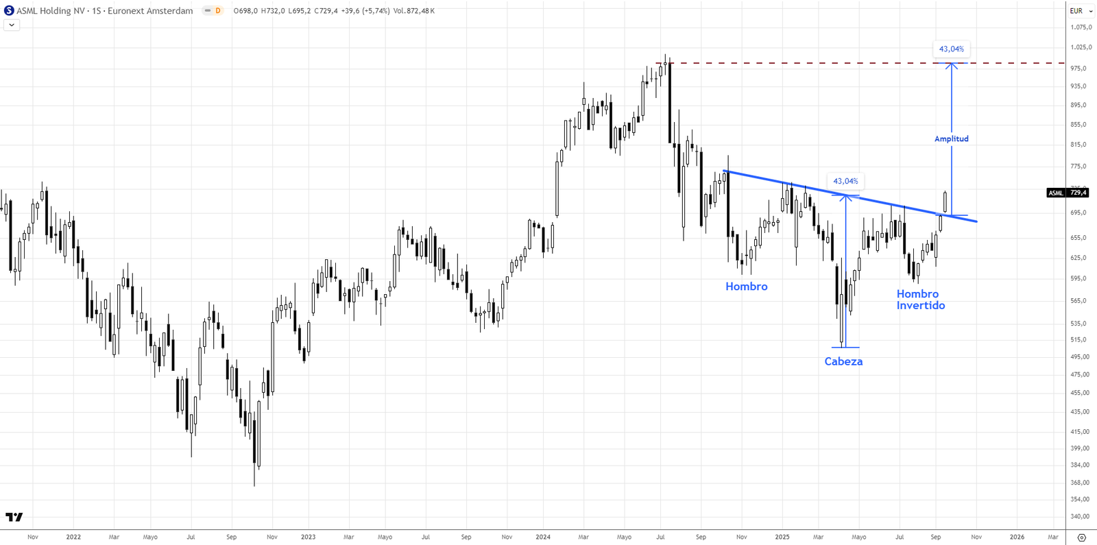 ASML: posible patrón de Hombro-Cabeza-Hombro invertido y repunte del +6%