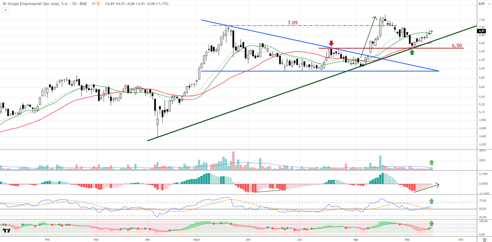 Grupo San José ha comenzado la semana con un movimiento al alza acompañado de volumen superior a la media de 20 sesiones, un dato relevante en un contexto de acumulación. El precio ha recuperado la media móvil de 20 sesiones, actuando como soporte dinámico en fases anteriores. El MACD se encuentra en fase de recuperación y cerca de cruzar a positivo, mientras que el RSI supera su media de 14 periodos al alza. Además, el flujo de capital se gira claramente hacia la entrada de dinero. Todo apunta a que el valor podría estar iniciando una nueva fase impulsiva.