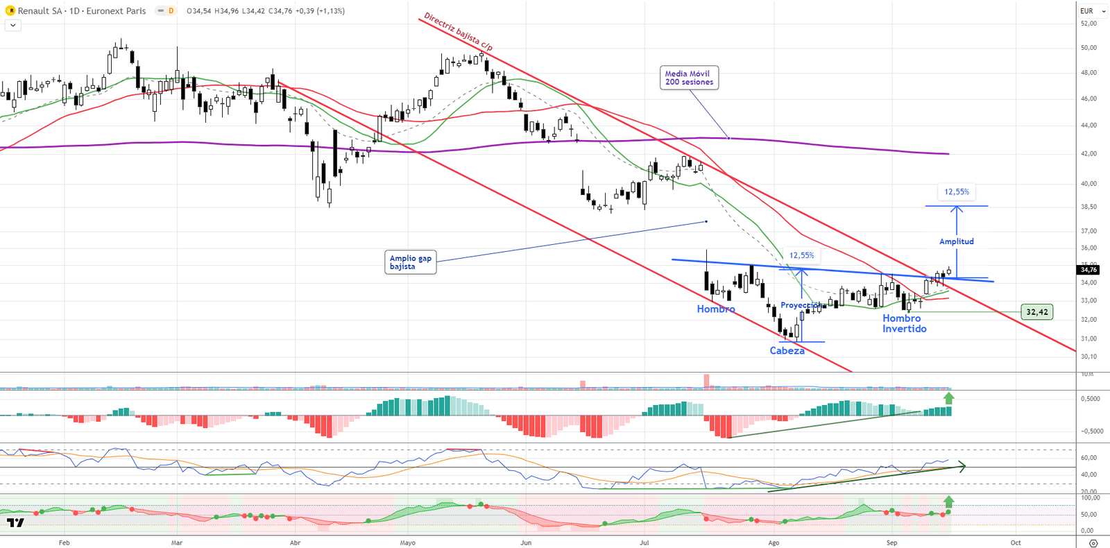 Renault confirma una estructura de cambio de tendencia tras romper su directriz bajista de corto plazo. Lo más relevante es la activación de un Hombro-Cabeza-Hombro invertido, que proyecta un recorrido de aproximadamente el 12,5% hasta la zona de los 38,50 euros. El flujo de capital ha pasado de negativo a positivo, lo que indica entrada de compras institucionales. Esta mejora técnica se acompaña de una evolución favorable de los indicadores, reforzando la fiabilidad del patrón.