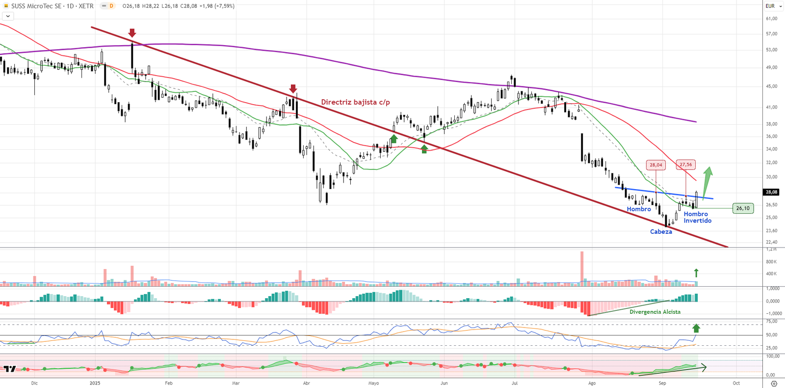 El valor alemán SUSS MicroTec muestra una potente reacción técnica con un repunte del 7,5% en la última sesión, acompañado de fuerte volumen. Rompe resistencias importantes en los 27,50 y 28 euros, y lo hace con confirmación en precios de cierre. Técnicamente, se activa un patrón de Hombro-Cabeza-Hombro invertido que puede abrir un recorrido muy interesante. El MACD refleja divergencias alcistas en crecimiento, el RSI supera los 50 puntos y el flujo de capital es claramente positivo. El soporte clave se sitúa en los 26,10 euros, nivel ideal para considerar un stop.