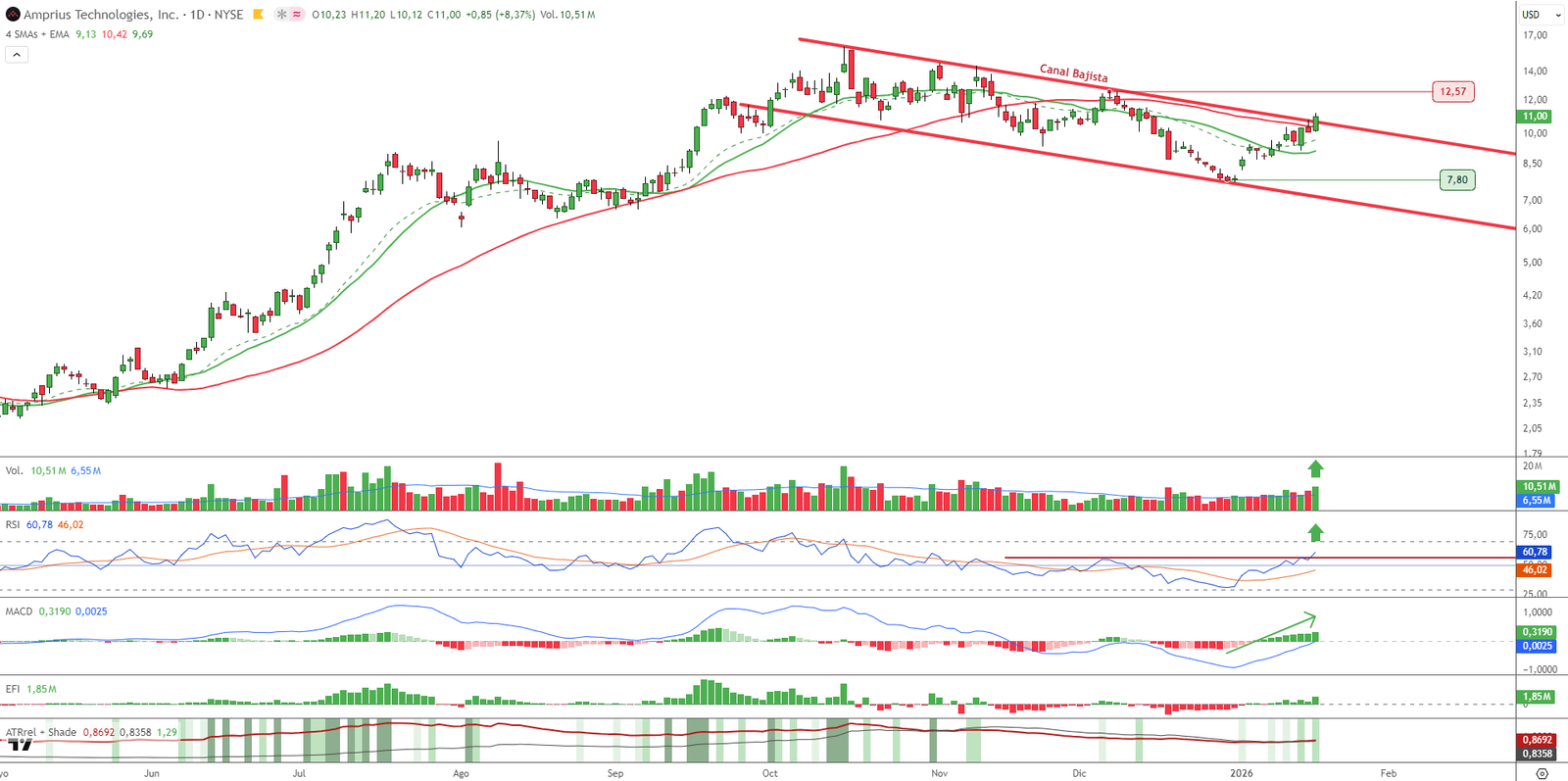 Desde un punto de vista técnico, Amprius Technologies presenta una mejora significativa de su estructura tras romper al alza el canal bajista que venía guiando el precio durante los últimos meses. Esta ruptura se ha producido con confirmación en cierre semanal y acompañada de un incremento del volumen, un factor clave para validar el movimiento.