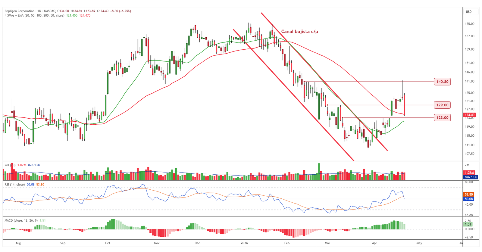 Repligen fue el valor más delicado de la jornada tras chocar previamente con resistencia y perder después al cierre tanto un soporte importante como la media móvil simple de 50 sesiones. El deterioro también empieza a reflejarse en los indicadores, lo que obliga a vigilar de cerca el contexto. Aun así, no se da por cerrado ningún escenario mientras no se alineen todas las señales de debilidad. Precisamente ahí reside la parte más útil del análisis: distinguir entre un daño técnico relevante y una señal definitiva.
