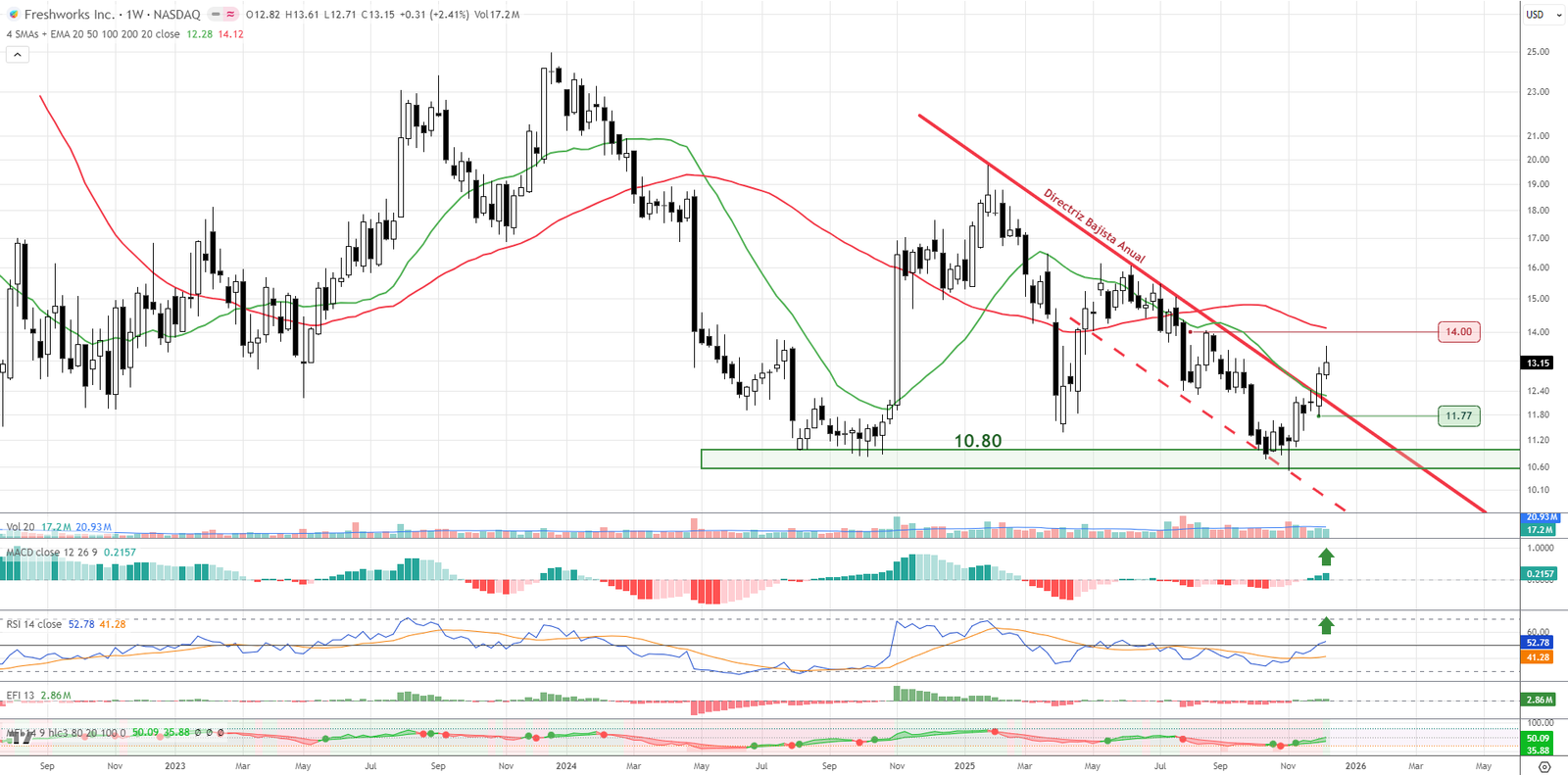 Freshworks presenta una estructura técnica muy interesante tras rebotar con fuerza desde la zona de los 11 dólares y perforar su directriz bajista anual. El precio ha logrado situarse por encima de la media móvil de 20 semanas, lo que refuerza el cambio de sesgo.